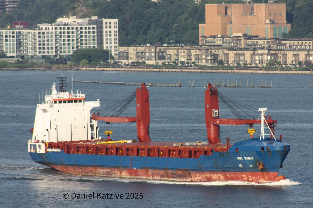 The Antigua flagged heavy lift ship BBC Eagle came up the North River Friday morning, passing the Lincoln Tunnel vents and heading for the Port of Albany. I believe they will load some heavy GE equipment for export overseas.