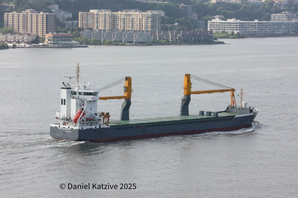 Trito Navigator was inbound on the North River Thursday evening, heading for the Port of Albany. The small 8,137 deadweight ton bulk ship was arriving from Vallvik, Sweden with a cargo of wood pulp for paper mills up north.