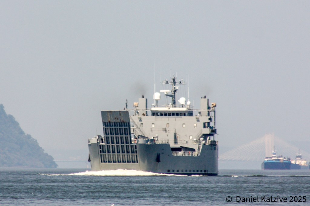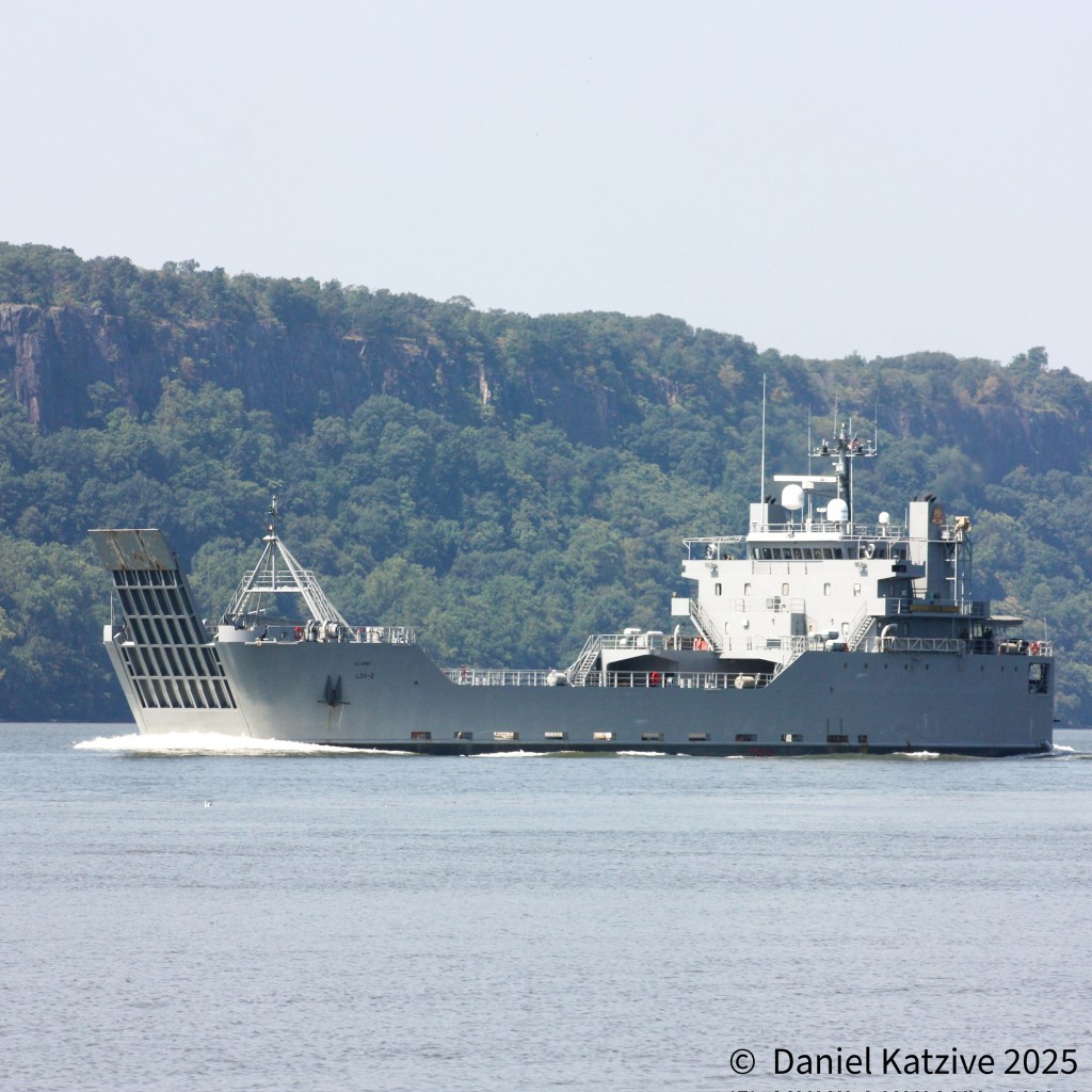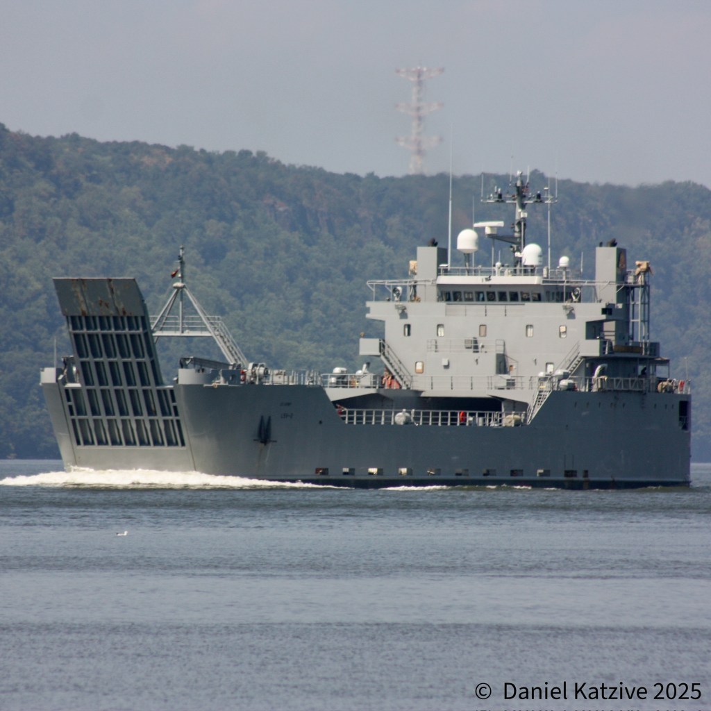 The US Army logistics vessel CW3 Harold C. Clinger passed Spuyten Duyvil heading south Friday afternoon. The 273-foot long RoRo had come up the North River from Norfolk earlier in the day, traveling up the Hudson to Bear Mountain Bridge before turning around and heading back to sea and Virginia. Clinger is based near Norfolk now and, I believe, has a reserve training role. She made a similar excursion in May of 2024, though only going as far up as Yonkers then, and presumably these trips are for training purposes. The ship is designed to move army cargo, vehicles or tanks long distances and can discharge on beaches as well.