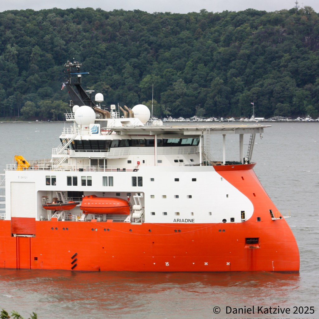 The cable-laying vessel Ariadne arrived off Spuyten Duyvil at the top end of the North River this week to work on some of the final sections of the Champlain Hudson Power Express. The cable, which will bring hydro-generated electricity from Canada to New York City beginning next year, makes a turn at this point, entering the Harlem River after running under the Hudson from Rockland County to here. It will pass under the Harlem River, along the north shore of Randalls Island and then cross the East River to its landing point in Astoria.