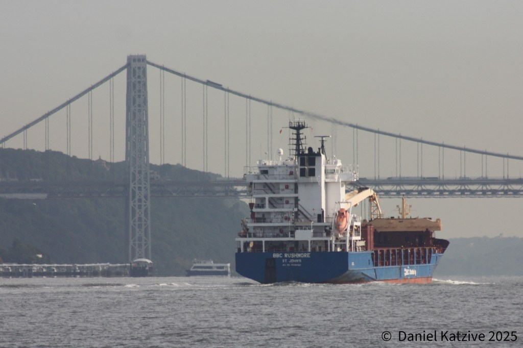 Heavy lift cargo vessel BBC Rushmore came up the North River Thursday bound for the Port of Albany. She will either be delivering some project cargo there or possibly loading GE equipment for export.