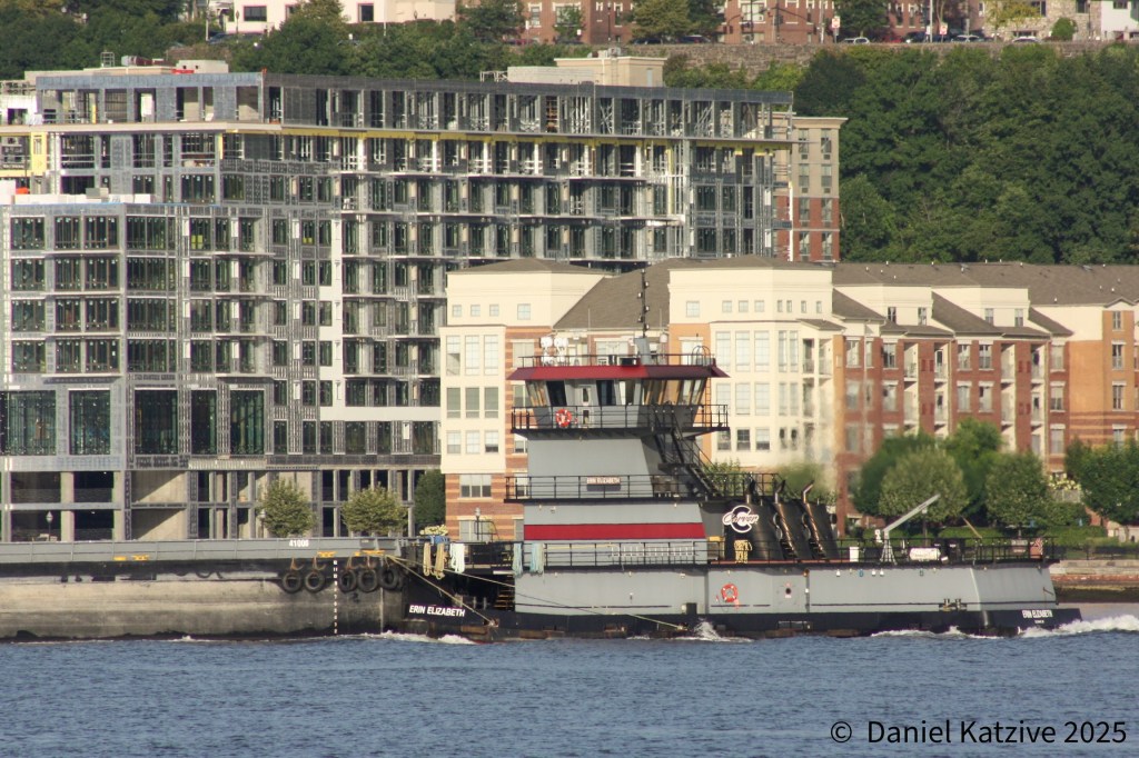 Carver Companies towboat Erin Elizabeth brought hopper barges down the North River in the final days of August, traveling from Coeymans to the harbor. They passed West New York where new construction continues seemingly without end.