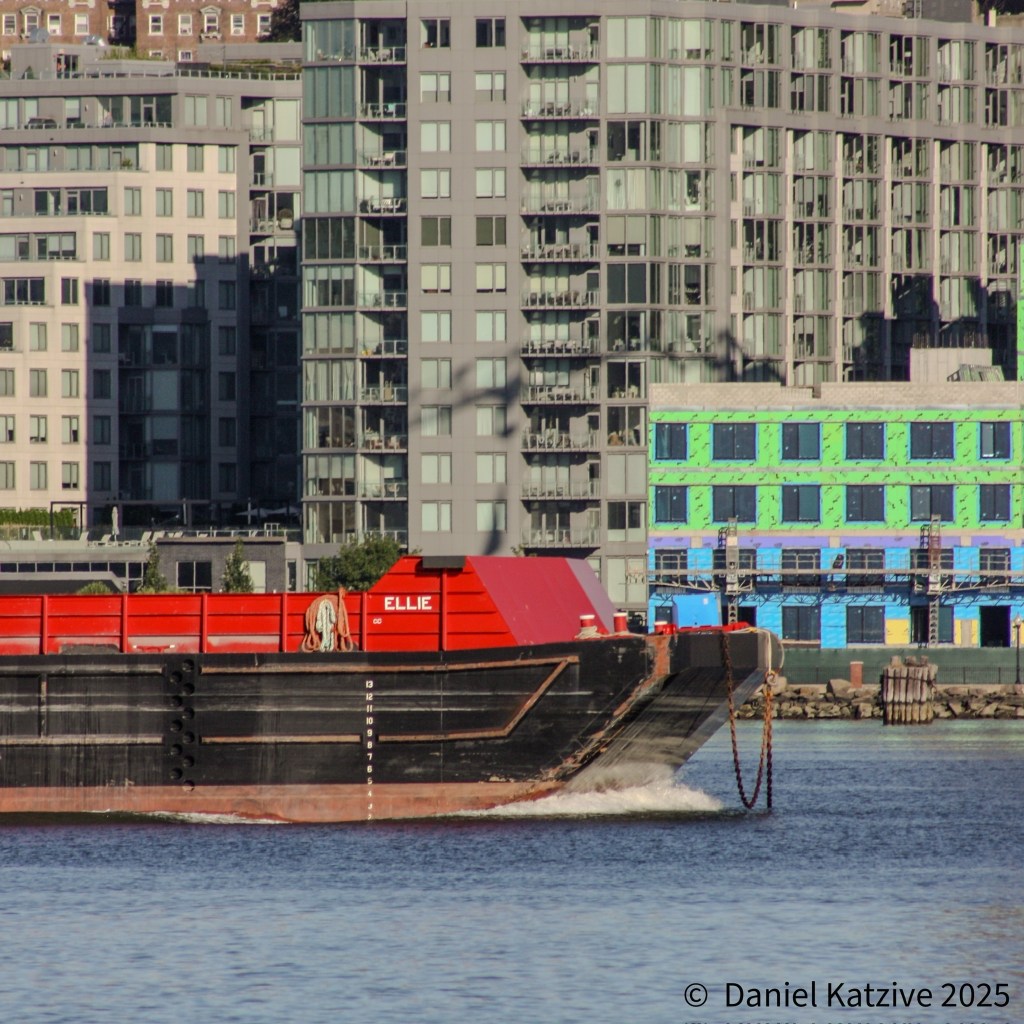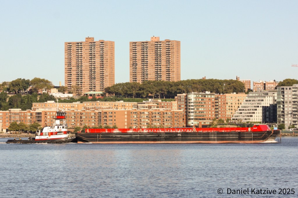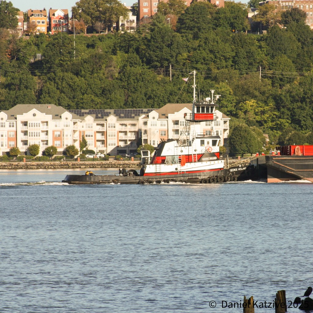 Norfolk Tug’s George Holland has been making regular trips up the North River with a hopper barge this summer, heading for the quarry in Clinton Point near Poughkeepsie where they collect crushed stone for delivery to distribution points around the metropolitan area and return back down the river. These pictures were taken on Sunday of Labor Day weekend and, less than a week later, George has just completed another round trip, delivering their cargo I believe based on what I can see on AIS to New York Sand and Stone by the Brooklyn Navy Yard. The Clinton Point quarry has been in operation for over 100 years and dolomite rock from there is probably embedded in most structures we see in the region.