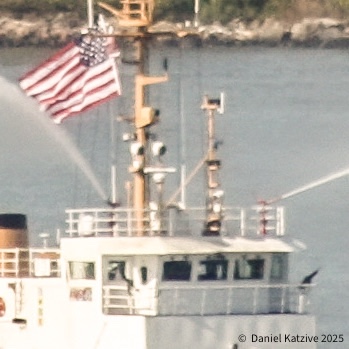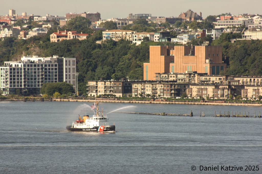 The 9/11 memorial events were underway downtown as Coast Guard icebreaker Penobscot Bay came up the North River as far as Pier 99 with her fire monitors running, passing the Lincoln Tunnel vents and a Donjon Marine crew working on seasonal dredging at the cruise terminal. In addition to providing a visual salute, Cutter 107 had machine guns mounted on her bridge wings so also serving a security role. Penobscot Bay is one of two big icebreaking tugs based in Bayonne whose primary mission is keeping the Hudson clear for navigation up to Albany in the winter.