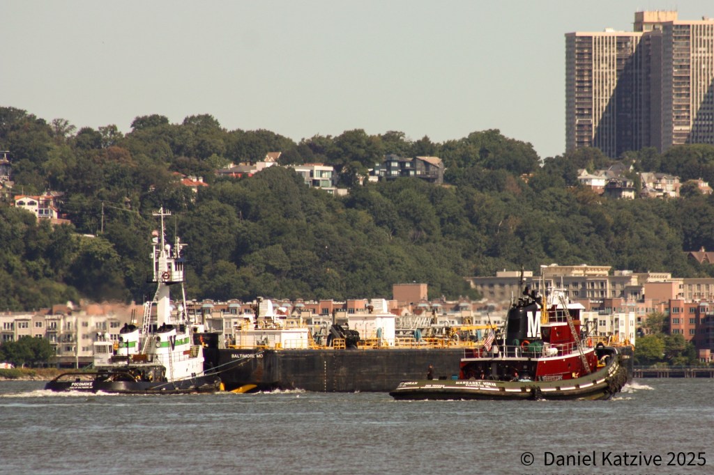 A pair of Moran tugs ran light up the North River on Thursday, heading for Buchanan where they would assist a bulk ship leaving the dock at the wallboard plant after delivering a cargo of gypsum. On the way up, Margaret shadowed Vane tug Pocomoke heading for Albany with a tank barge probably partially loaded. Miriam had two jobs on the Hudson that day—she headed for Buchanan directly from assisting the visiting German navy ship leaving Pier 88 in the morning. As of Saturday morning, Pocomoke is back on the North River, anchored off North Bergen after calling at Buckeye Albany, while Margaret and Miriam are busy assisting with arrivals and departures at the container terminals.