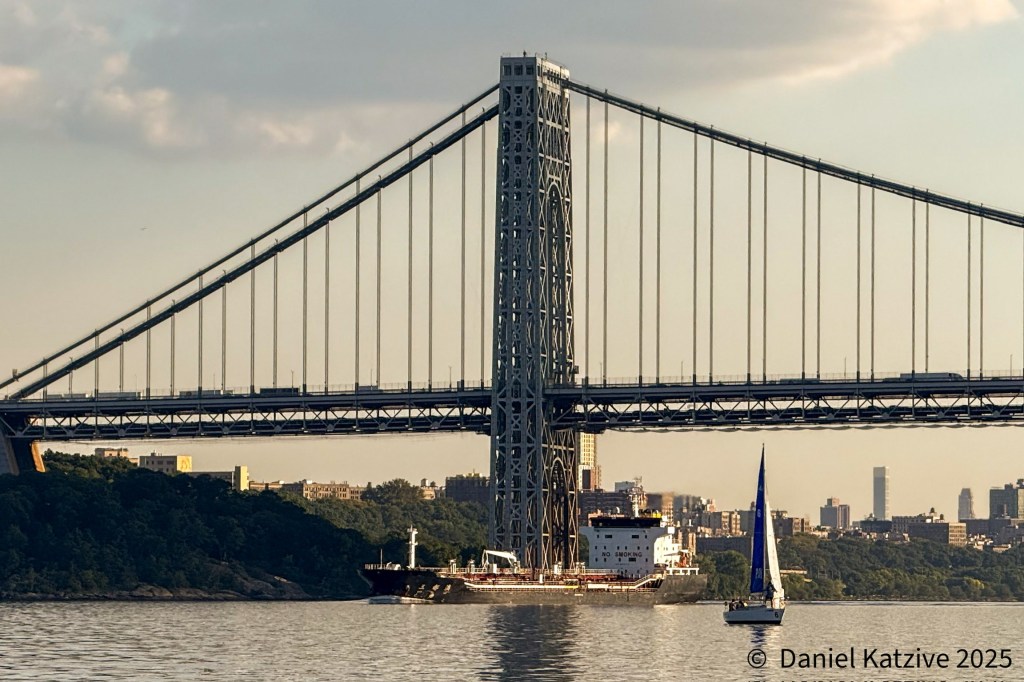 San Du Ao, a small 13,000 deadweight ton Hong Kong flagged bitumen tanker, came up the North River Friday evening, passing the GW Bridge, Spuyten Duyvil and J24 sailboat. The tanker was arriving from Colombia, not a very common point of origin for cargos coming up the Hudson, and was likely carrying asphalt. San Du Ao is currently unloading at a terminal in Rensselaer. Coming soon to a pothole near you.