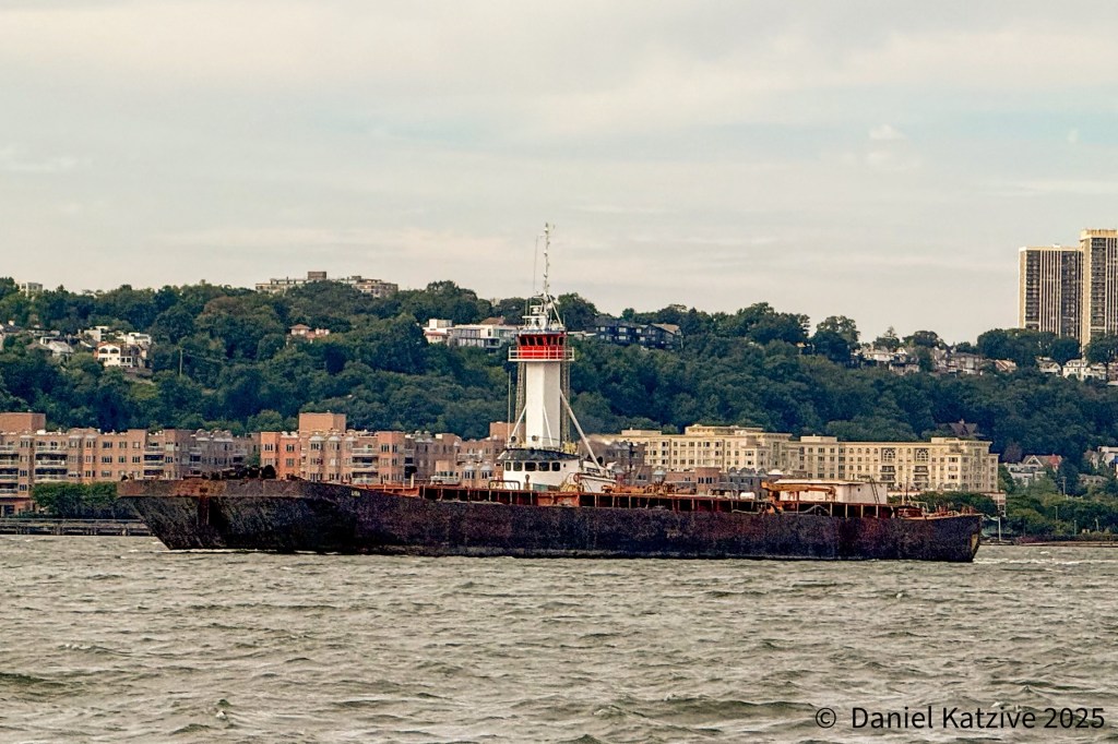 In a very unusual move, NYC’s DEP brought in a privately-owned sludge tanker barge, the Lisa, to move residual solids from the North River water treatment plant to the Passaic Valley plant in Newark for dewatering on Tuesday, with the tug Vinik No. 6 moving her. The city normally relies on its own fleet of five tankers for this work, but a number of these tankers have been out of service lately: the Hunts Point has been tied up at Wards Island since a fatal explosion several months ago, the old North River tanker has been out of service all year, and, until recently, the tanker Rockaway was getting work done at GMD in Brooklyn Navy Yard. The Lisa has serviced the North River plant in the past but not, as far as I know, for many years and I don’t know why she was brought in this week. Please feel free to reply in the comments if you know more.