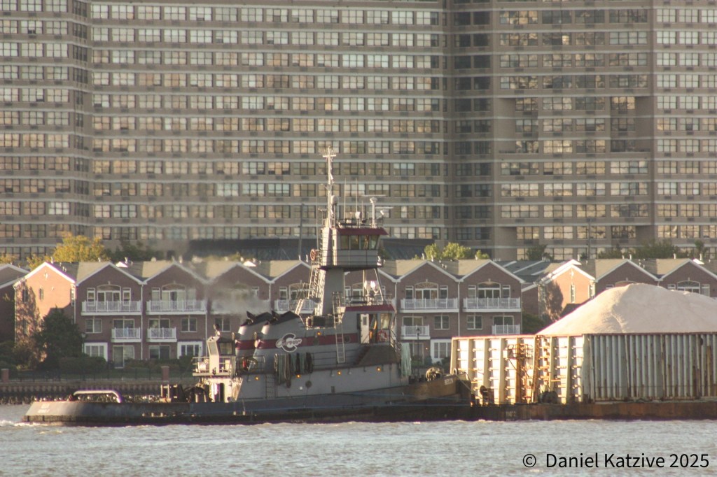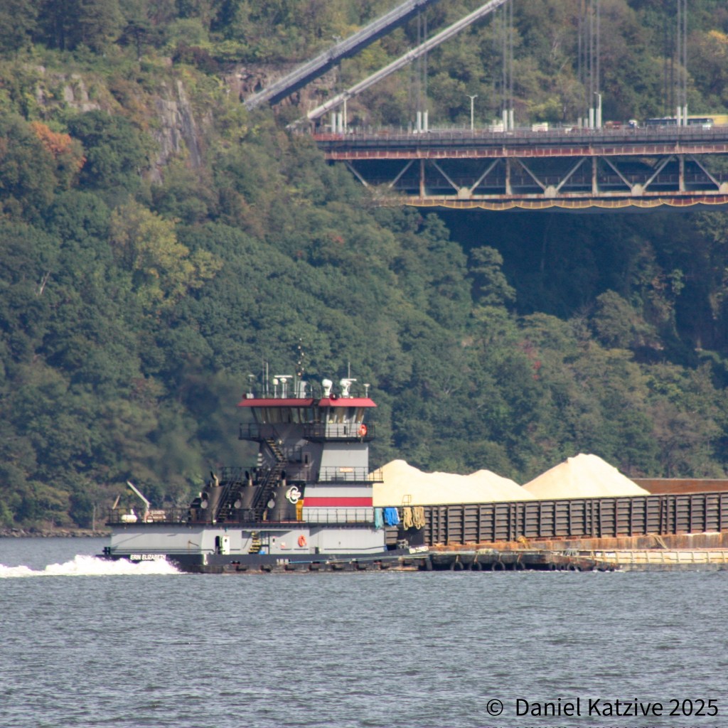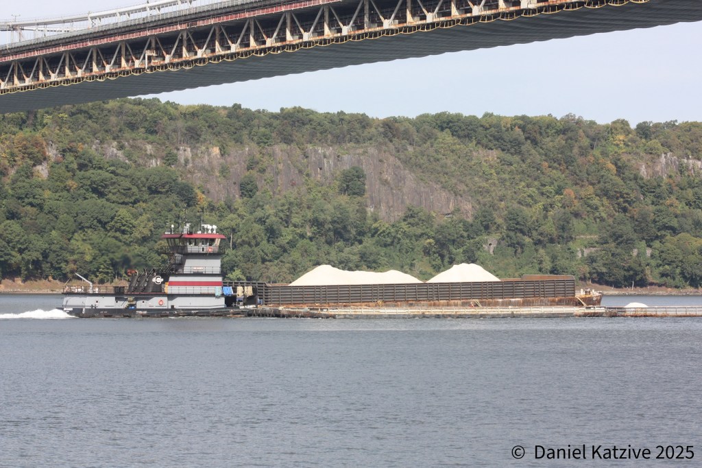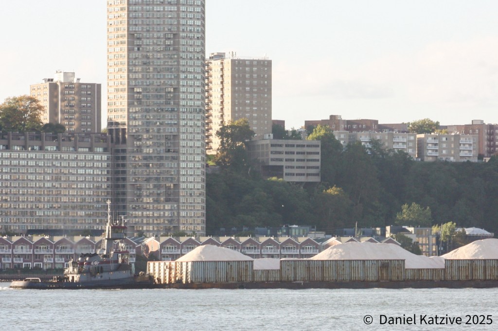 The Carver Companies tug Helen passed up the North River Friday afternoon, headed for her home port of Coeymans with a high-sided hopper barge loaded with prodigious amounts of what I believe was probably salt lightered off the bulk ship Astro Sanistra, in from Egypt and anchored in the Upper Bay off Bay Ridge. Erin Elizabeth followed the next morning with more of the same, seen passing under the GW Bridge in the photo, and in the afternoon the 650-foot Marshall Islands flagged bulker herself came through, seen passing the old convent atop the Englewood Cliffs, also headed for Coeymans and presumably considerably “lighter” than she was when she arrived in New York Harbor a few days ago. As of Sunday morning, Astro is passing Hudson, NY after having anchored overnight off Hyde Park.