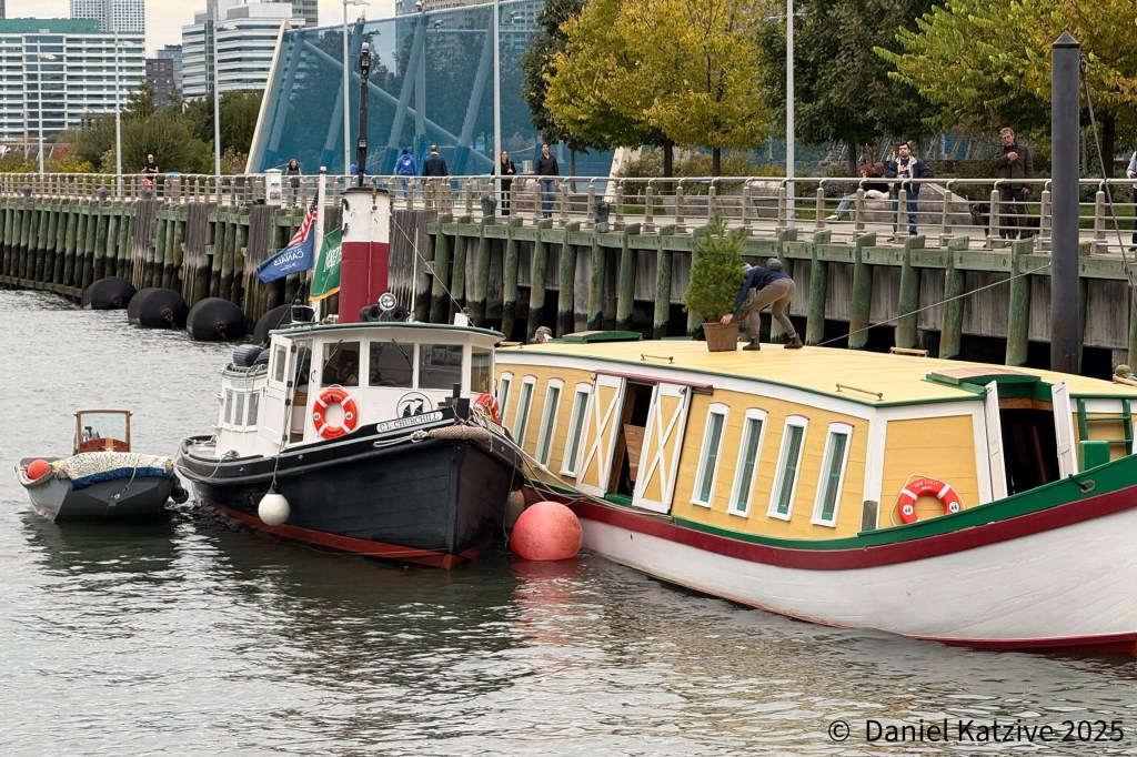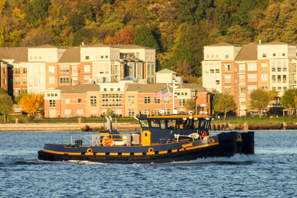 Earlier on the same day, in timing which was perhaps coincidental but also seemed to emphasize the historical continuity between the canal’s origins and its present day relevance, the brand new canal tugboat Rome passed up the North River. Rome is the second of three new boats manufactured by Blount Boats in Rhode Island for the New York State Canal Corporation and was heading for delivery to its new owners up north. Rome passed Seneca Chief and the Churchill off Sleepy Hollow—perhaps there was a salute.