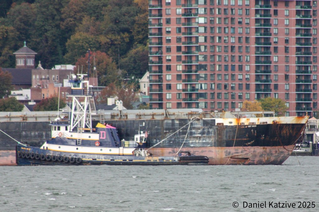 Dann Marine’s Calusa Coast is anchored on the North River off Edgewater with covered hopper barge DMT 9000 this week. She is usually based in Baltimore I believe, and may have ducked in on the way back from a run to Boston, similar to the last time we saw her anchored on the river in January coming back from Maine with a tank barge. It’s uncommon to see tugs with hoppers like this at anchorage in the river which is generally used by tugs with tank barges and ATBs but in high winds we sometimes get more variety in what we see here.