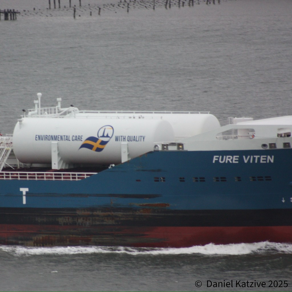 Fure Viten, a small 18,000 deadweight ton Swedish flag tanker, arrived on the North River Wednesday morning bound for the Buckeye terminal in Albany. The tanker is LNG powered, with tanks evident on the deck, and also able to run on liquified biogas. Fure Viten was constructed in 2021 in a shipyard in China and would have been subject to port fees assessed on Chinese-built vessels calling on US ports earlier this year, but those fees have now been suspended as a result of negotiations.