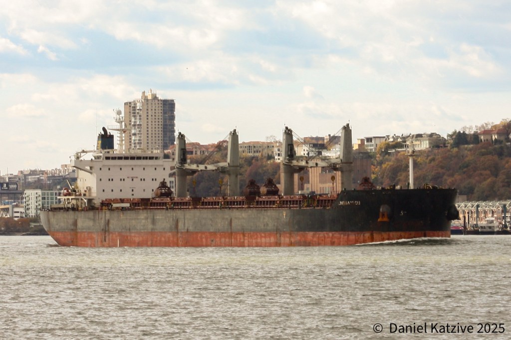Lindsaylou, a 620-foot Marshall Islands flagged bulk ship, came up the North River at midday Friday, overtaking the the Poling & Cutler tug Marilyn George Rensselaer-bound with the loaded Edwin A Poling oil products barge. Lindsaylou was arriving from Egypt and heading for the Port of Coeymans and a salt cargo seems most likely.