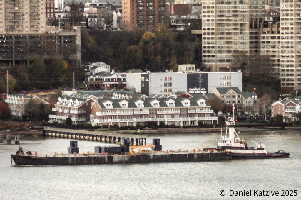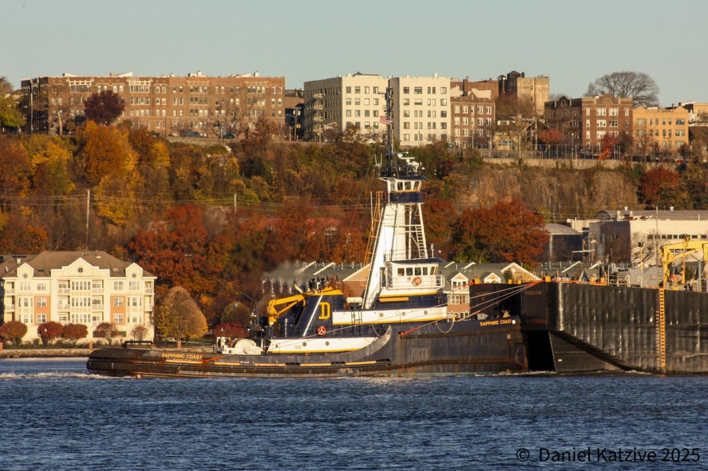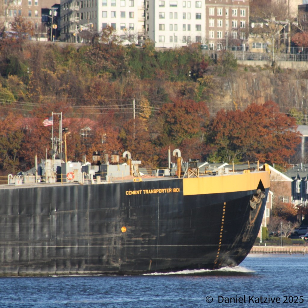 Cement barges are moving on the North River this week. Tuesday morning saw Dann Marine’s Sapphire Coast with light Transporter 1801 heading back to the Amrize plant near Ravenna, NY to load more cargo after discharging at terminals in New England and also calling at the materials pier in Brooklyn’s Sunset Park. The evening before, Coral Coast came through with a loaded cement barge from the plant heading for College Point on Flushing Bay in Queens.