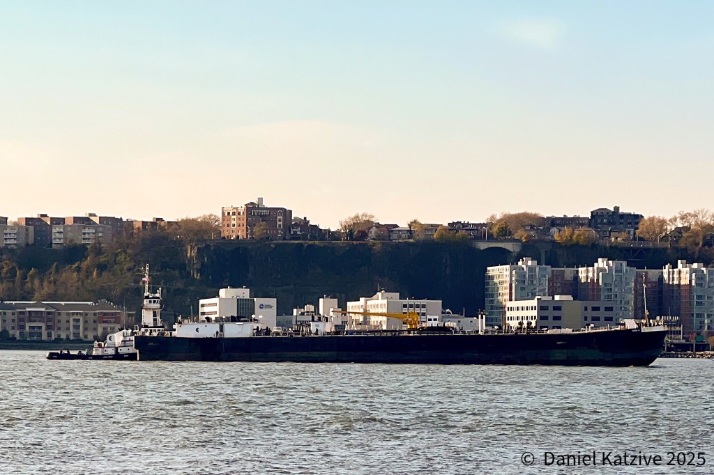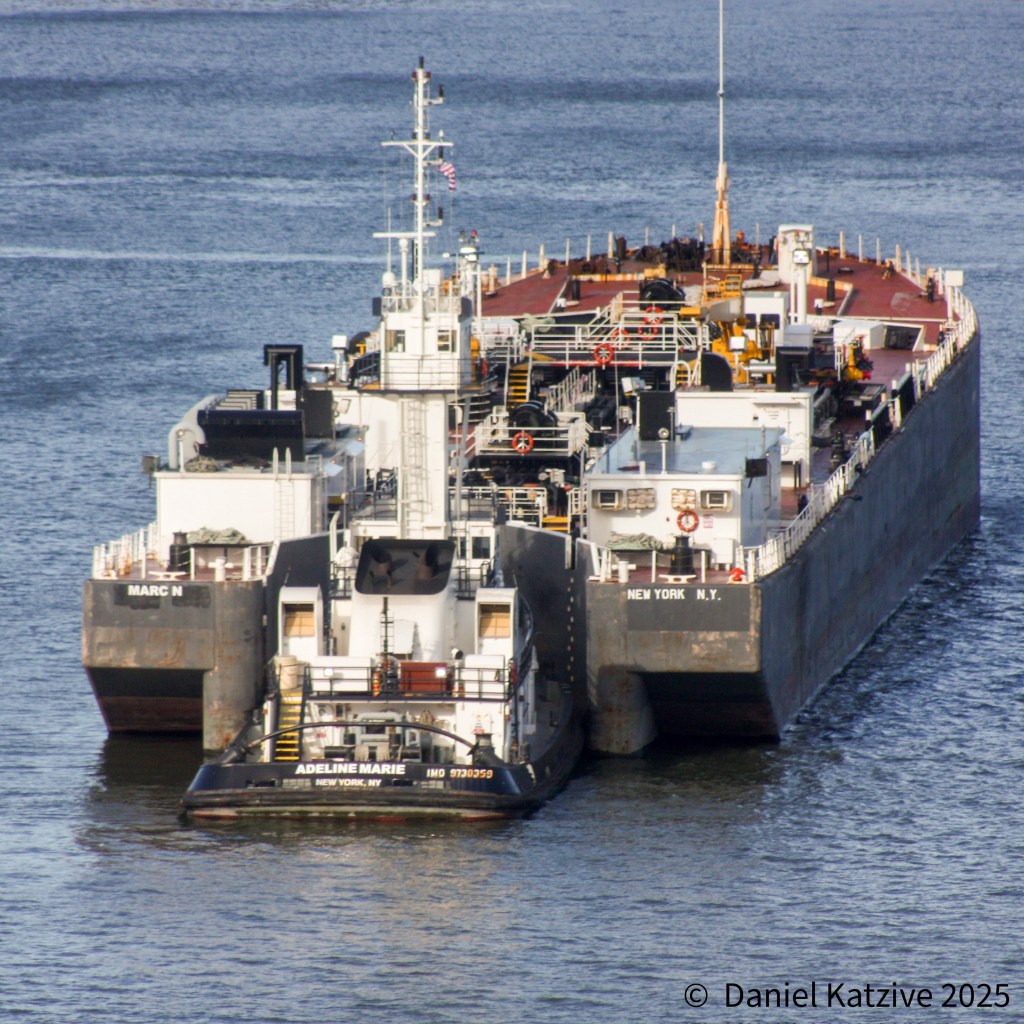 FROM THE ARCHIVES: Thanksgiving 2022 saw Centerline tug Adeline Marie with the barge Marc N among the units anchored in the North River. This year, Adeline was tied up along the Arthur Kill for the holiday having just returned from a long trip to deliver a cargo in Savannah. This year, which I am not in town to observe, AIS shows Centerline’s CF Campbell spent the holiday on the river, along with Ruth Reinauer who we saw at anchor earlier in the week, plus Kirby’s Cape Canaveral and Cape Hatteras further north. Hope all crews had a pleasant holiday.