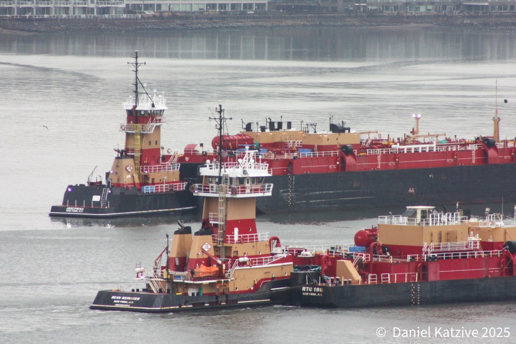 The Dean Reinauer/RTC 106 ATB (4,000 HP tug built in 2013 paired with an 108,000 barrel barge) came up the North River Tuesday, passing colleagues on the Josephine/RTC 83 ATB (4,400 HP tug built in 2018 paired with an 86,000 barrel barge) anchored off Guttenberg. Although Dean’s barge looked loaded, the unit was apparently not ready to head for a destination, instead lingering a few hours at anchor a half mile north of Josephine before heading back to the harbor where she remains Thursday morning while Josephine remains at anchor on the North River.
