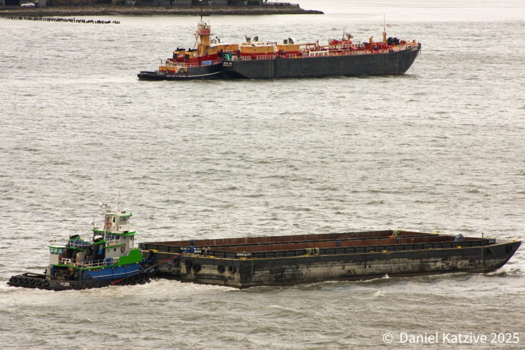 In mid-December, Haugland Group LLC ’s newest tug Lily Anne came up the North River with a pair of hopper barges, passing the Lucy Reinauer at anchor with the 46,000 barrel tank barge RTC 42. Haugland acquired the 1981-vintage 1,800 HP former Weeks Marine tug earlier this year, adding a fourth tug to their fleet and this was the first time I have seen her on the North River. Lucy Reinauer is older, built in 1973, though like all of Reinauer’s older tugs she has been substantially modified and updated. Monday morning (today) finds Lily up at Haugland’s materials port facility in Tompkins Cove on the Rockland County side of Haverstraw Bay, while Lucy is at Reainauer’s Staten Island base.