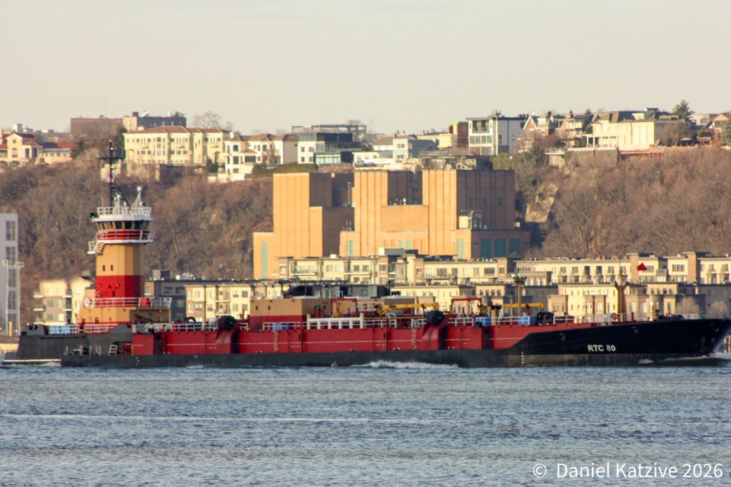 Reinauer’s Kristy Ann ATB, an 8-year old 4,400 HP tug paired with the 86,000 barrel 347-foot RTC 80 barge, was northbound on the North River Sunday morning, passing the Lincoln Tunnel vents with a New York Harbor products cargo bound for Albany. After anchoring overnight off Hyde Park, the unit continued on her way at sunrise Monday.