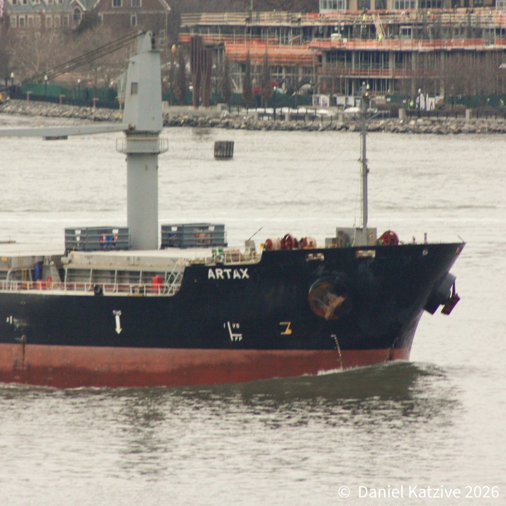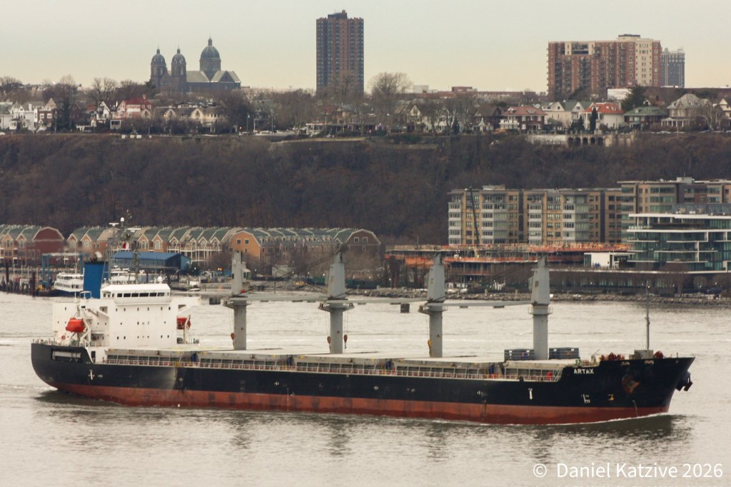 The bulk ship Artax, 583 feet long and Portugal flagged, came up the North River Monday morning with a cargo of Turkish cement. Artax had first called on Providence, RI to partly unload and was now heading for Cementon in the Town of Catskill NY where an import terminal sits on the site of a decommissioned cement manufacturing plant. As of Friday morning, Artax remains tied up at the terminal.