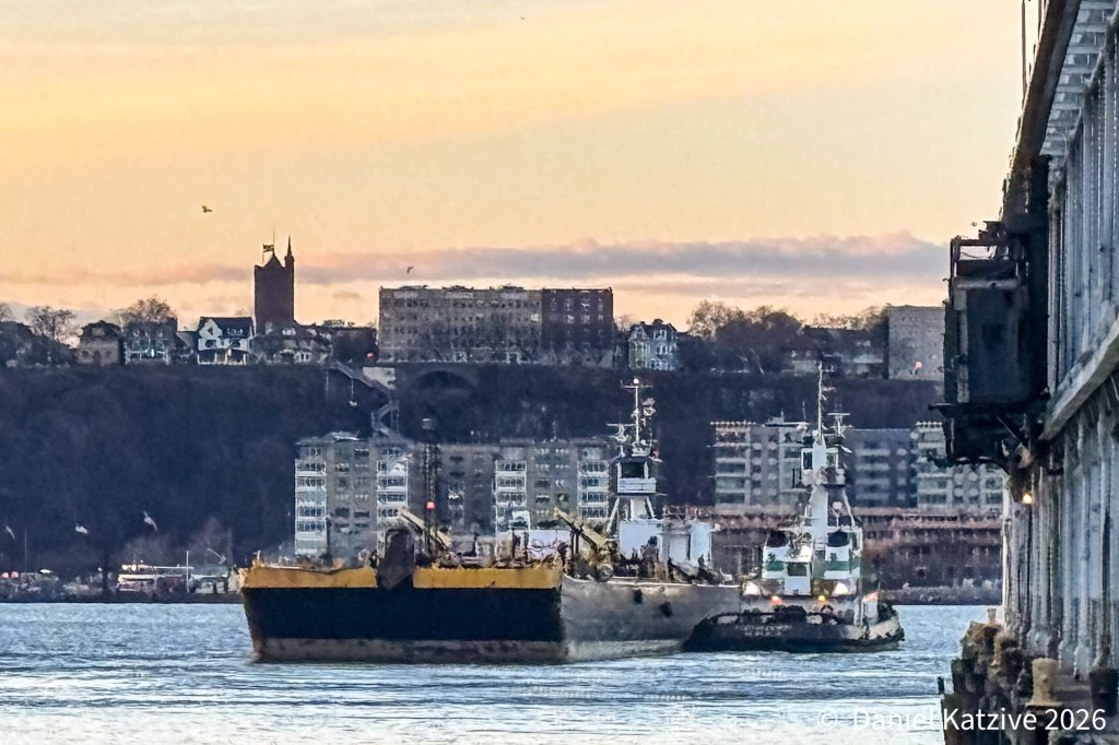 A pair of Vane Brothers tugs maneuvered a bunkering barge out of the tight space between North River Piers 88 and 90 on Monday just before sunset. The city’s Economic Development Corporation noted this week that Pier 90, on the right of the photo, has deteriorated to an extent it must now be taken out of service, reducing capacity at the terminal by 1/3rd (see article on W42ST for more).