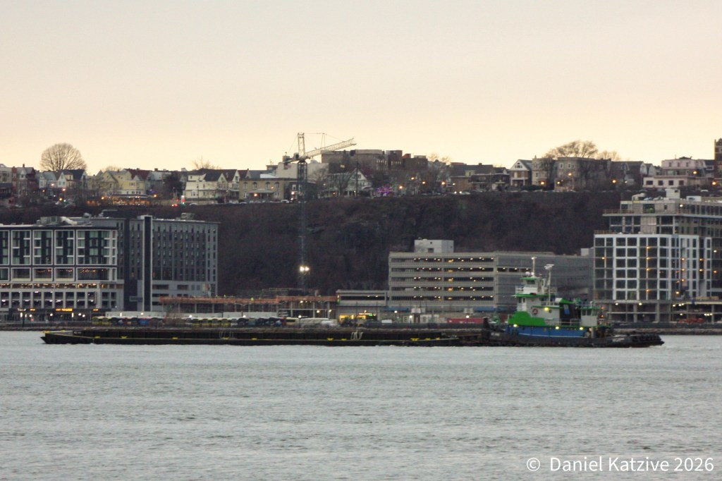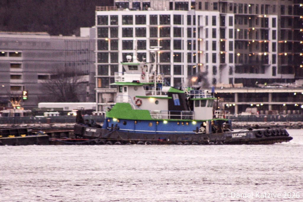 Haugland Group tug Lily Anne came down the North River early Saturday just ahead of the first round of weekend snow. Lily was bringing what looked like several loaded stone hoppers down from Haugland’s Tompkins Cove materials facility on Haverstraw Bay to the area of the aggregate pier on the end of 25th Street in Sunset Park. The 25th Street pier features in the city Economic Development Corporation’s Blue Highway master plan as a site that could be further developed for bringing construction materials into the city. After spending Saturday moving around New York Harbor, Lily was passing through the Narrow’s Sunday morning and heading for Jamaica Bay, probably heading Haugland’s Inwood materials facility on Jamaica Bay near JFK.
