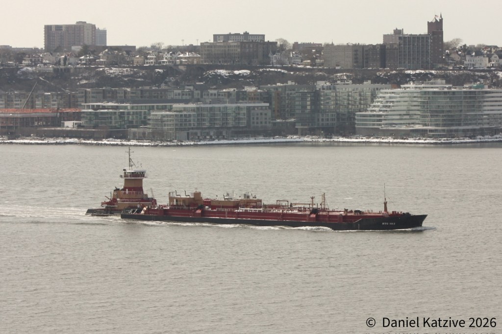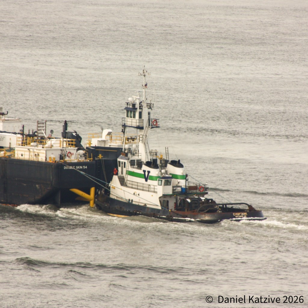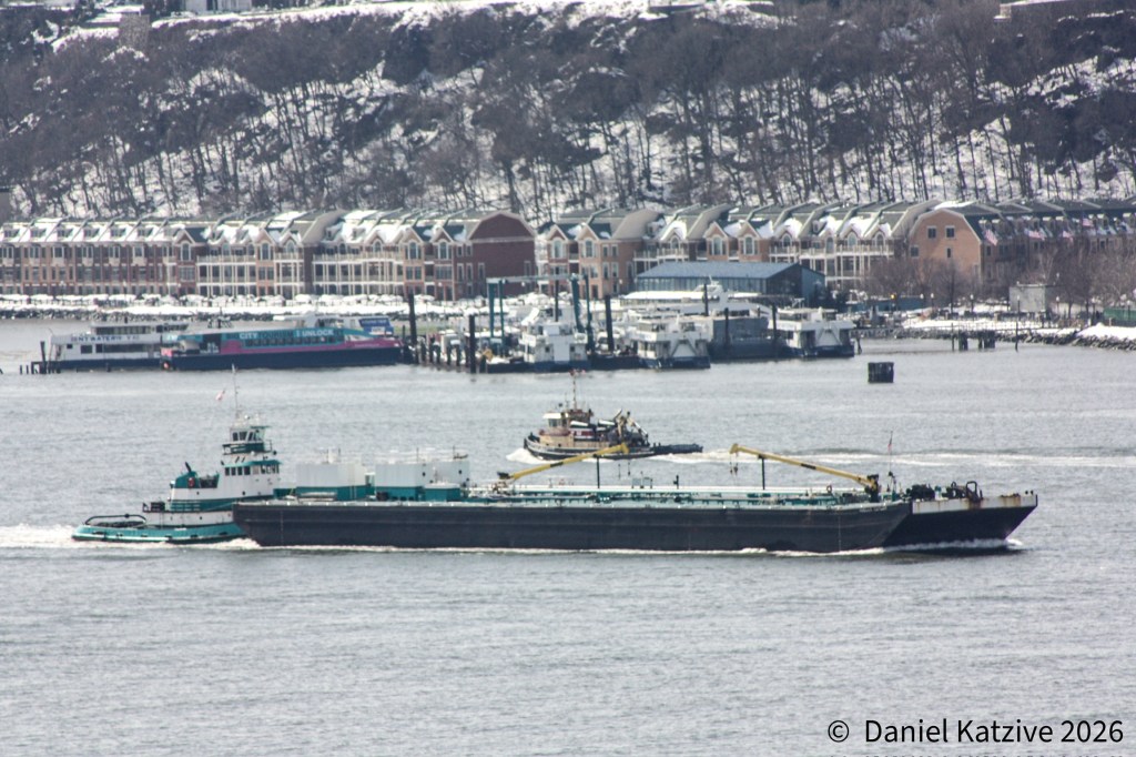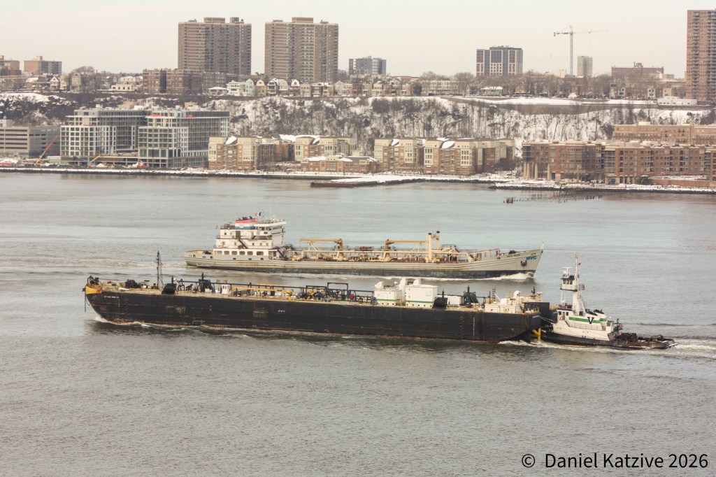 Tank barges were moving on the North River Thursday as temperatures climbed. Vane’s 4,200 HP Choptank left anchorage off Riverdale in the morning with the 54,000 barrel capacity Double Skin 54 and headed for Bayonne’s IMTT, passing the DEP sludge tanker Red Hook on two whistles on the way.