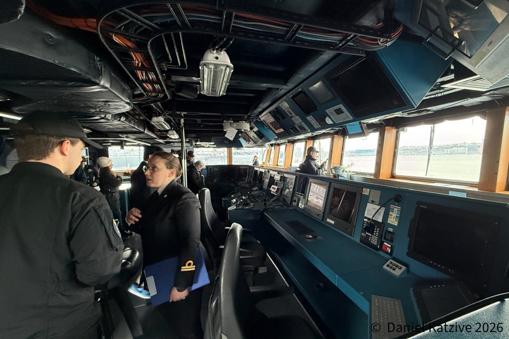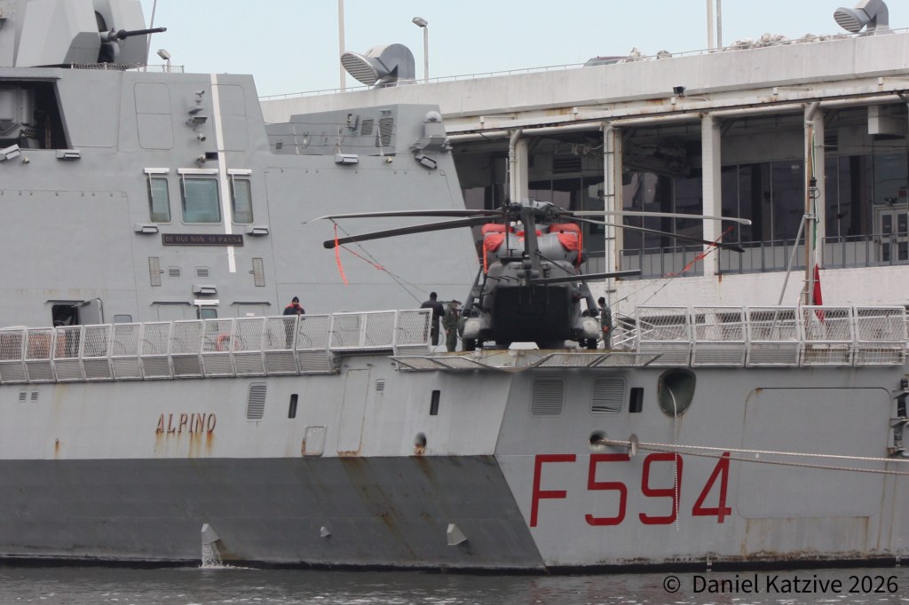 The Italian warship Alpino, NATO Frigate 594, arrived at Pier 88 late Tuesday evening. The ship’s visit was advertised in advance by the Italian consulate, but she came in quietly, with AIS off until reaching the Ambrose light where the pilot likely boarded. Alpino is on a tour of Atlantic ports after completing exercises in the North Atlantic with US carrier USS George HW Bush and her task force, a preliminary shakedown for the carrier group before returning to service after a period offline in Norfolk.