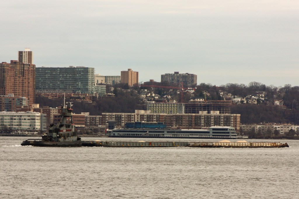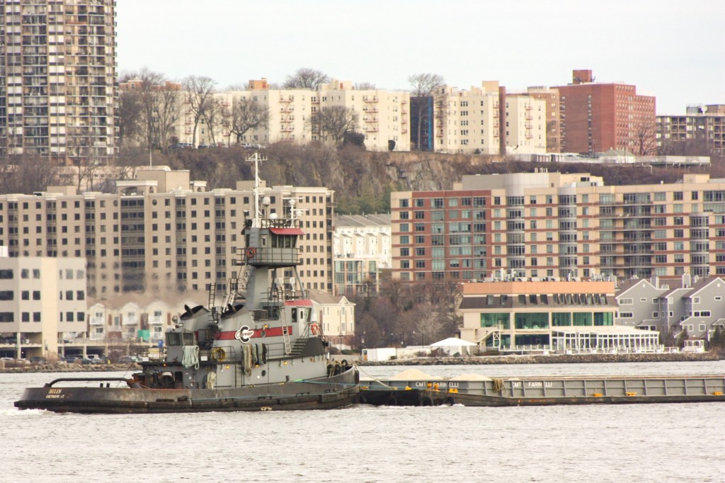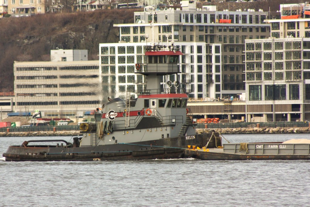 Carver Marine Towing’s 3,000 HP tug Helen was northbound on the North River Sunday, bound for the Port of Coeymans with hopper barges loaded what I believe was salt lightered off a bulk ship anchored in the Upper Bay. Road salt is in demand up north as municipalities look to rebuild their stocks after a cold winter, and Coeymans is a major distribution hub. Salt cargos over the past year or so seem to mainly originate in Egypt, but in the past we have seen supplies coming from Italy and Chile.