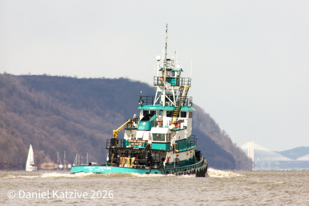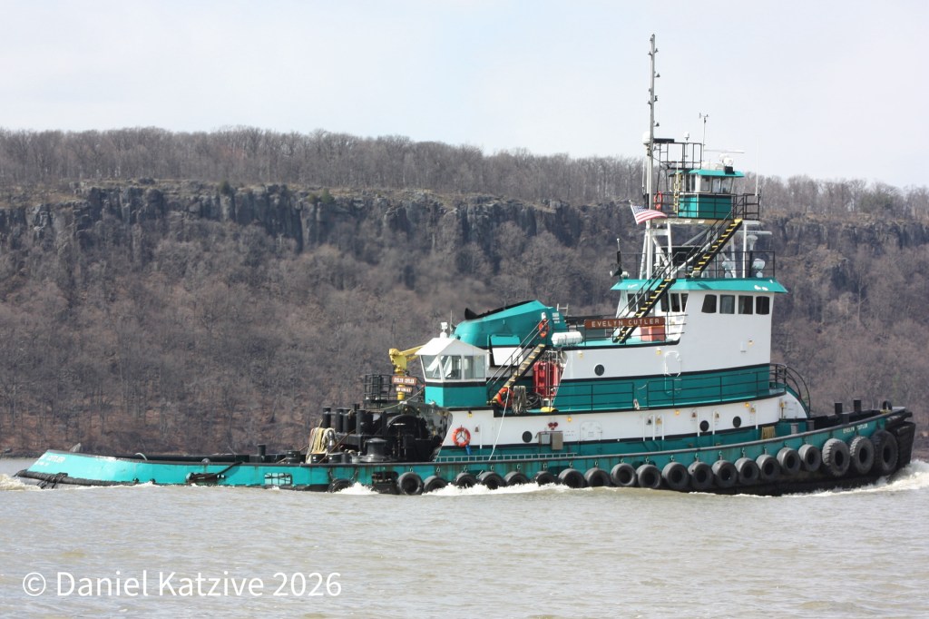 Poling & Cutler’s Evelyn Cutler ran light up the North River on Saturday afternoon, passing the Palisades at Englewood Cliffs and heading for the IPT terminal in Rensselaer. Kimberly Poling was there at the same time, and Evelyn perhaps took over her barge as Kimberly subsequently headed for the shipyard in Kingston. As of Monday morning, Evelyn is back in New York Harbor at the Kinder Morgan terminal on the Arthur Kill, with a barge presumably loading new cargo there.