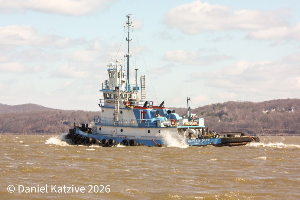 Dann Ocean’s Captain Dann ran light up Haverstraw Bay on Saturday morning, having come up from the North River heading for the shipyard in Kingston, probably to collect a barge. After a quick turn, the tug came back downriver, left town and headed for Philly, probably to deliver the barge she probably collected. By then end of the week, the Captain is back in New York Harbor on Newark Bay.