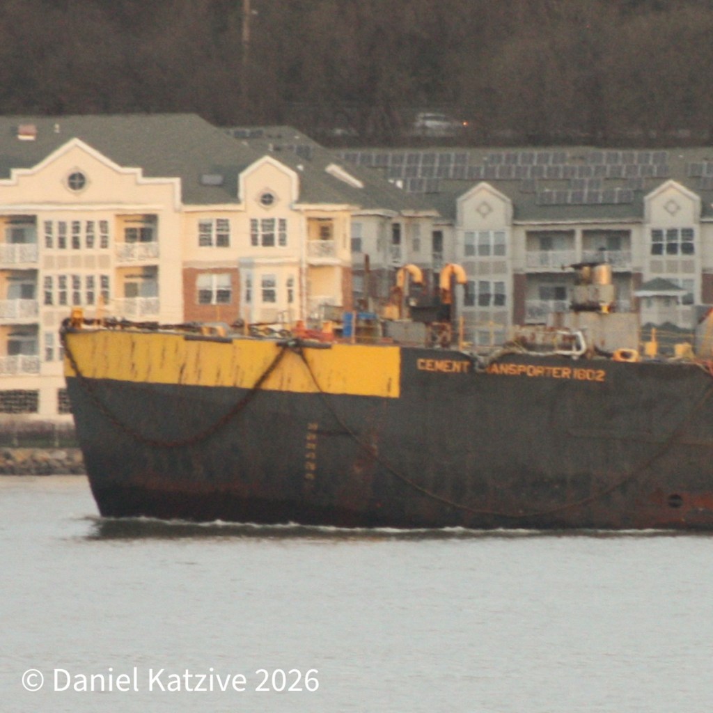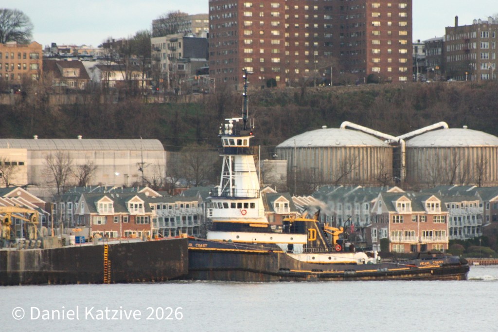 Cement is moving on the North River this month as construction activity ramps up with the spring thaw. Dann Marine’s Pearl Coast came down from the Amrize cement plant in Ravenna, NY on the first day of April with a loaded cement transporter. Pearl and other Dann tugs make regular runs down the Hudson delivering cement from the plant to terminals around New York Harbor and sometimes up to New England or down the coast. On this trip, Pearl headed for the cement terminal in Bayonne and then continued on to Boston.