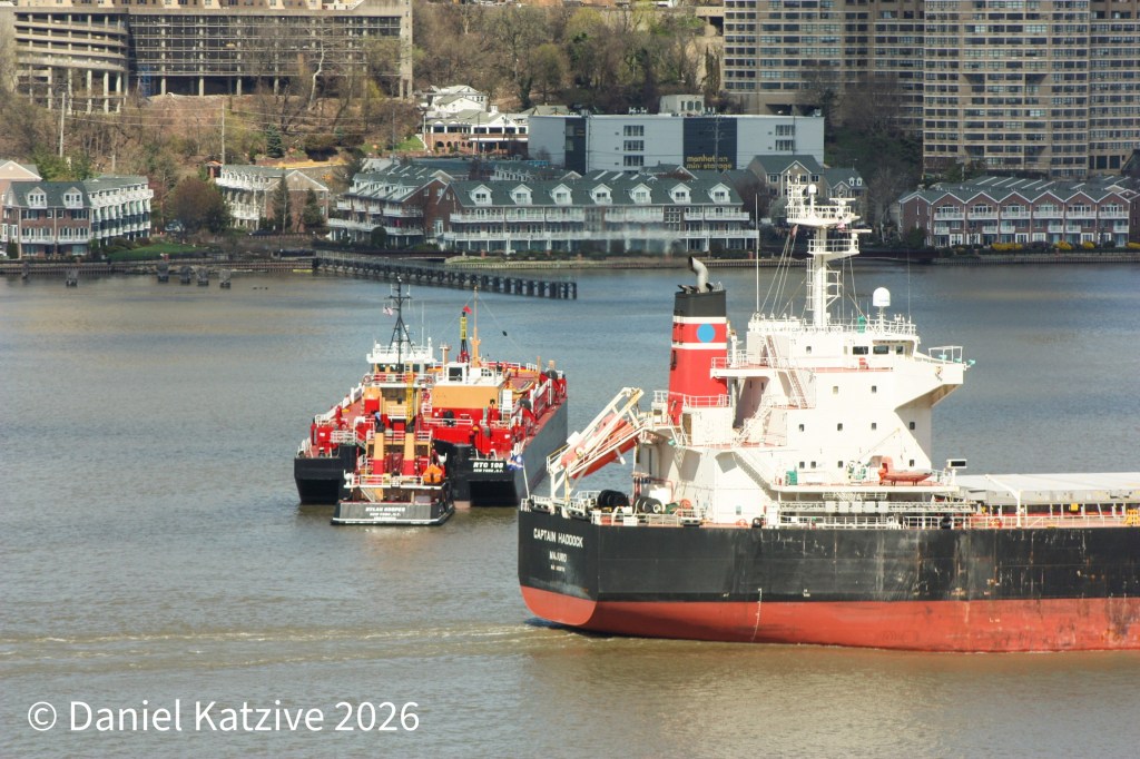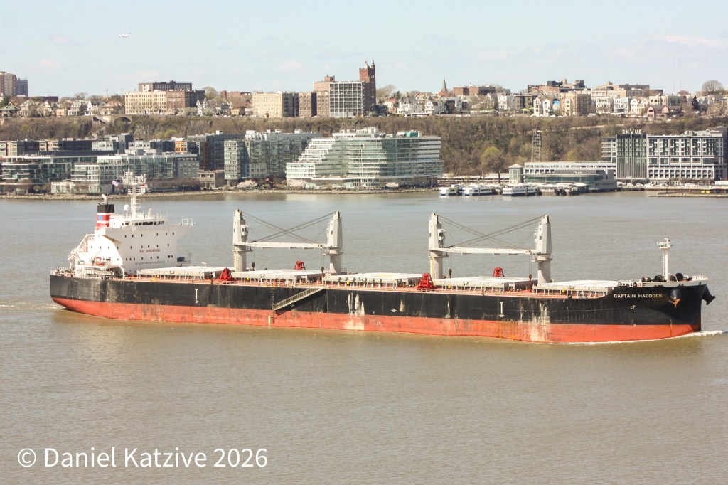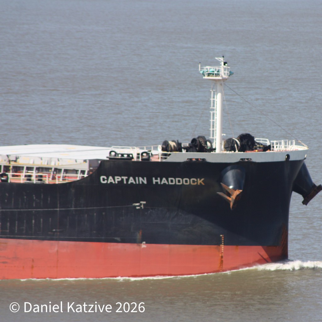 Thundering typhoons! The bulk ship Captain Haddock came up the North River Monday, Port of Coeymans bound and partially laden with salt after lightering off some cargo in the Upper Bay to Carver Marine barges last month and then killing some time at Ambrose Anchorage. The Captain is no doubt named for Belgian graphic novelist Herge’s mid-20th century sea-fairing adventurer and sidekick to Tintin.