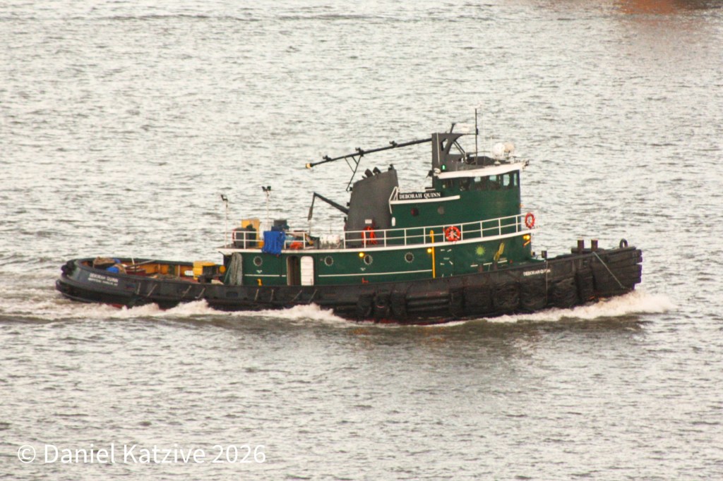 Deborah Quinn, a 1962-vintage 2,200 HP tug with classic lines, ran up the North River early Monday morning, heading for the shipyard in Kingston NY. Deborah is owned by Breakwater Marine Construction according to the Tugboatinformation website and I believe she has mainly been working on the East River resiliency project on the East Side for the past few years, but this week she was on the other side of town, likely heading in to have some work done at the Feeney shipyard.