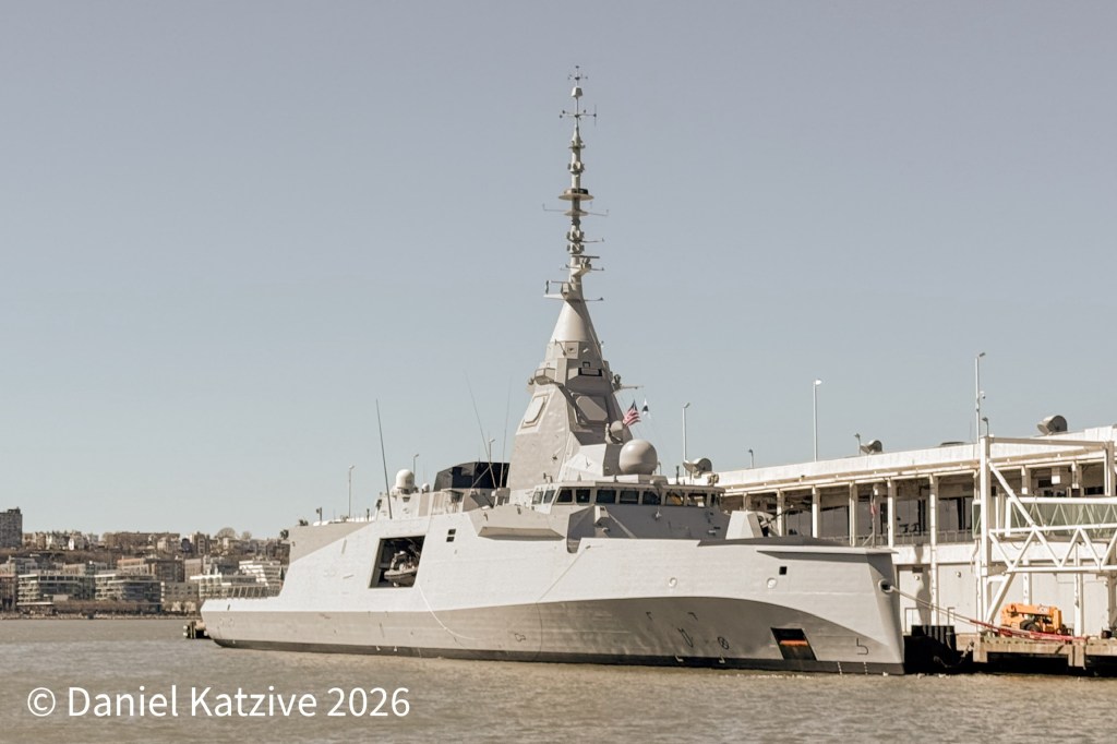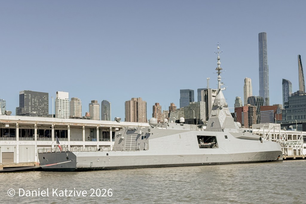 The French navy’s newest frigate, the Amiral Ronarc’h arrived in New York this weekend and has docked on the south side of North River Pier 88. The ship is the first of its class of defense and intervention frigates (FDI) and is on a trial deployment in the far north and western Atlantic. The visit was not advertised in advance and I don’t believe tours are being offered.