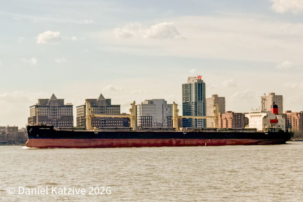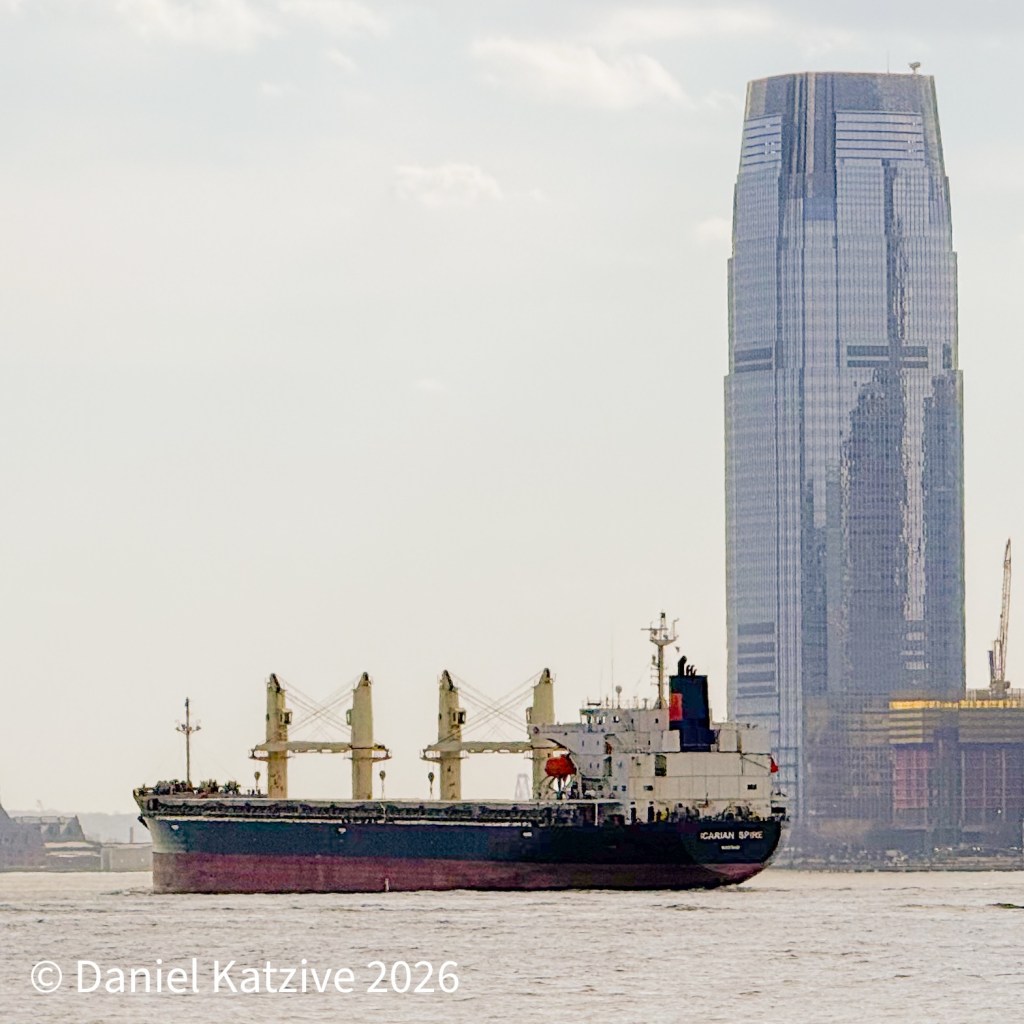 The bulk ship Icarian Spire, Bahamas-flagged, was exiting the North River on Tuesday afternoon, passing Hoboken and Jersey City and heading for sea. The 590-foot vessel was in ballast after discharging a cargo at the Port of Coeymans, possibly salt. She is signaling Savannah as her next port of call.