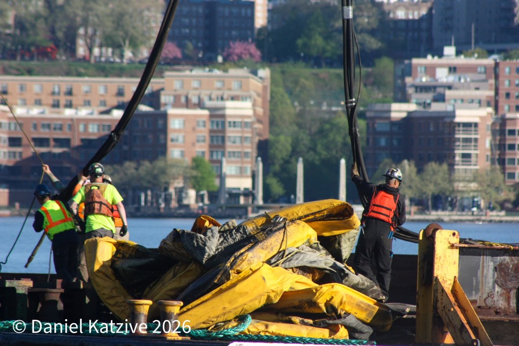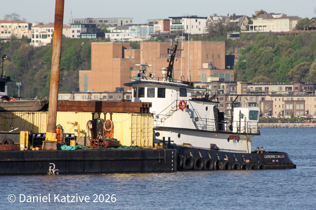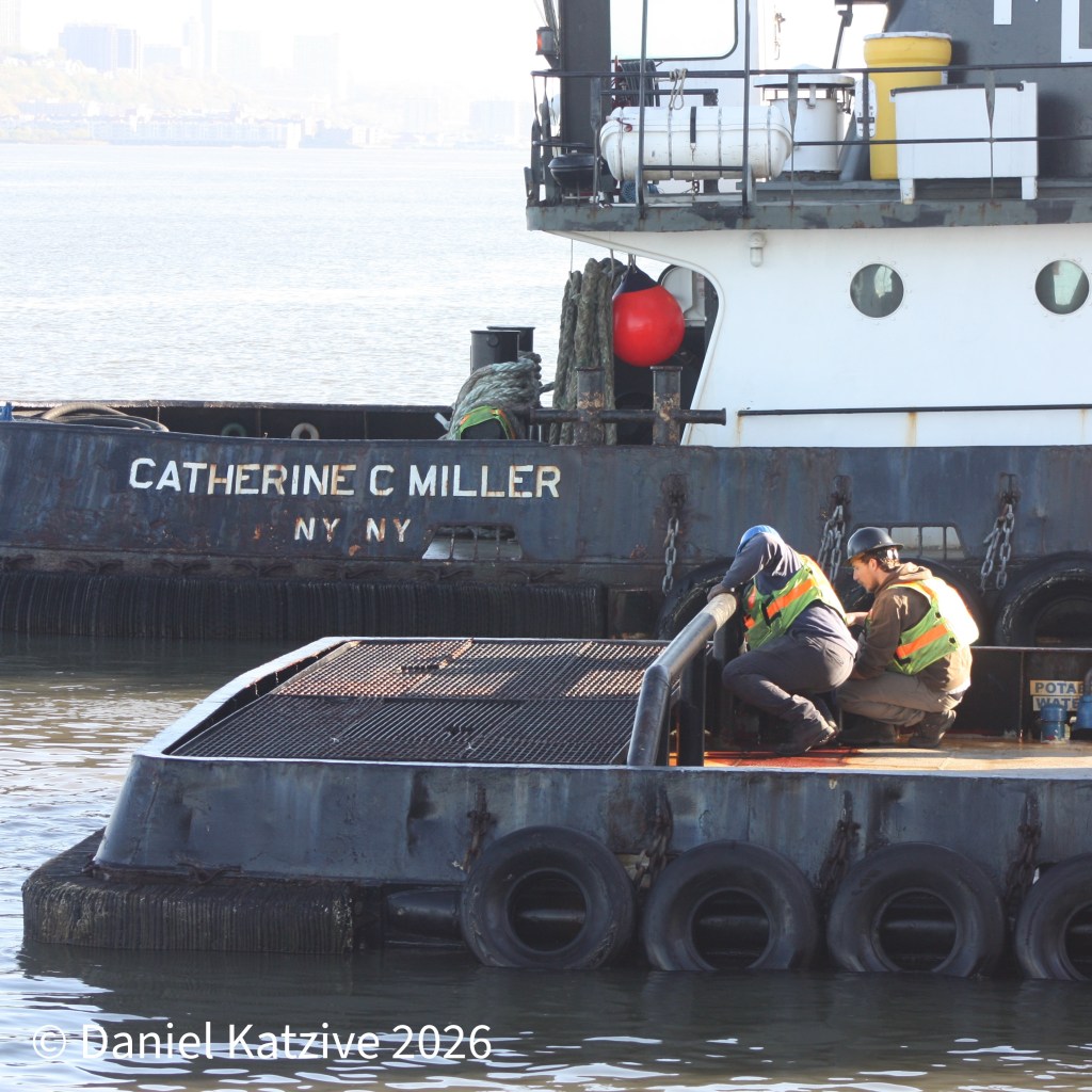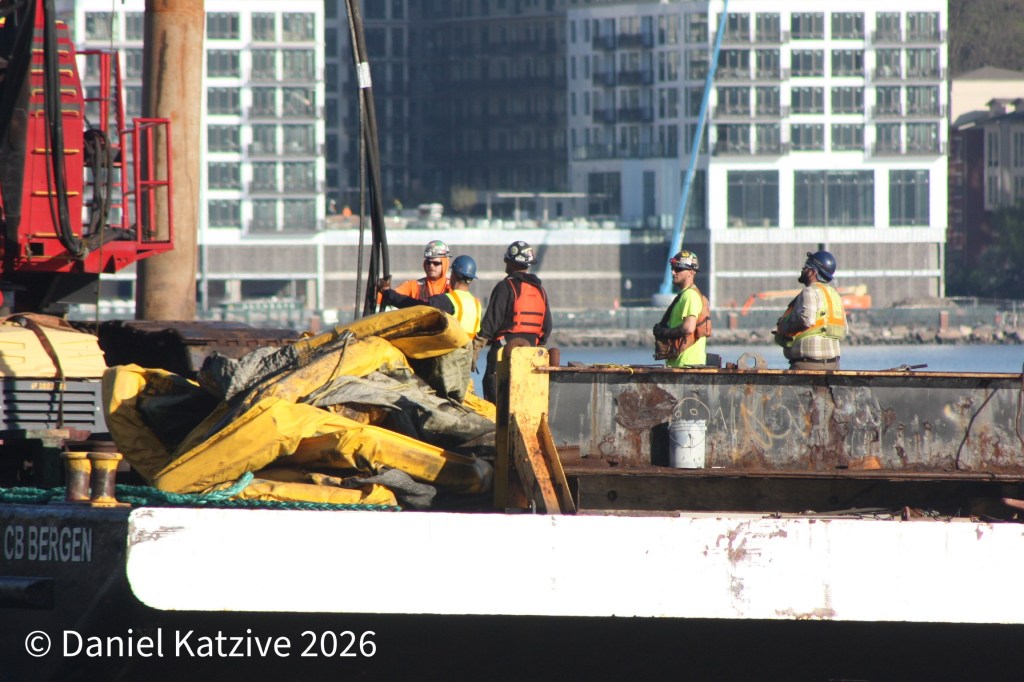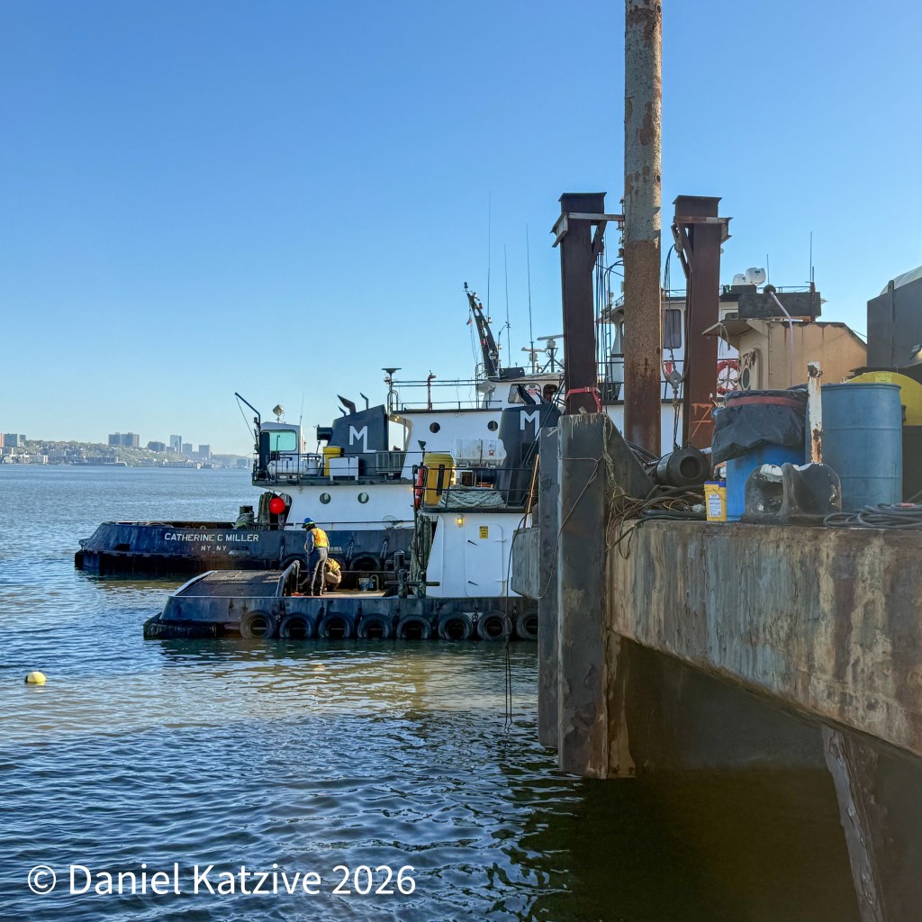A pair of Miller’s Launch tugs, Catherine and Shawn, were at Pier 94 Saturday morning maneuvering construction barges. Work to convert the pier to movie studios and soundstages with a public walkway along the north and west exposures is complete, but filings show piling restoration efforts will continue into 2027.