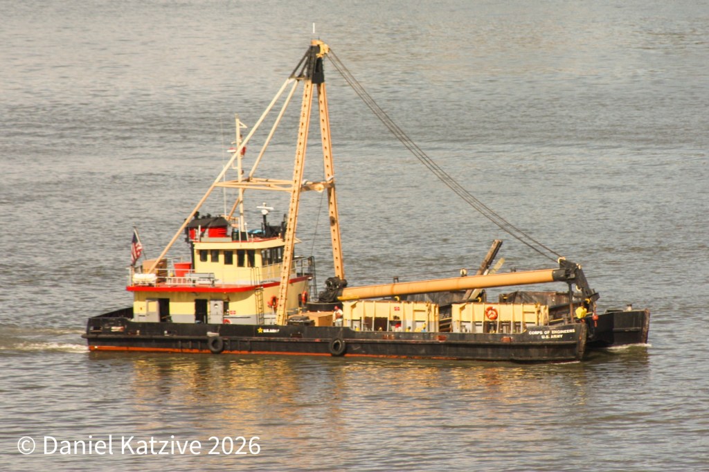 The Army Corps of Engineers Drift Collection Vessel Driftmaster was on the North River in mid-April, on patrol for hazards to navigation brought down by the spring melt to be cleared with her big crane. Driftmaster was launched in the 1940s making it probably the oldest vessel regularly working in New York Harbor. We don’t see this vessel all too often on the North River and she spends more time around the Upper Bay but she did come upriver again last week.