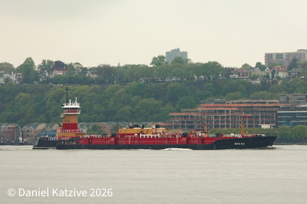 Reinauer’s Josephine/RTC 83 ATB, a 4400 HP tug pinned to a 85,000 barrel barge, was Albany-bound on the North River in the Thursday morning haze after loading a New York Habor cargo overnight at Tremley Point on the Arthur Kill.