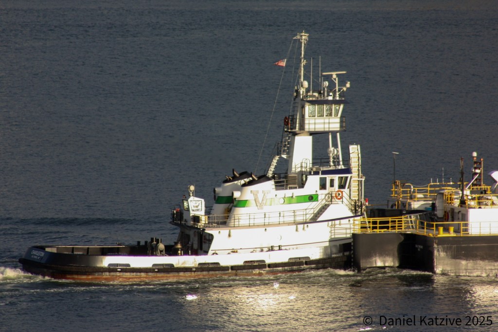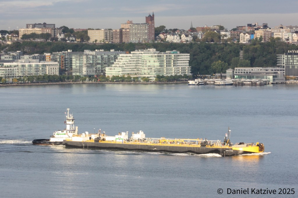 In a very unusual move, NYC’s DEP brought in a privately-owned sludge tanker barge, the Lisa, to move residual solids from the North River water treatment plant to the Passaic Valley plant in Newark for dewatering on Tuesday, with the tug Vinik No. 6 moving her. The city normally relies on its own fleet of five tankers for this work, but a number of these tankers have been out of service lately: the Hunts Point has been tied up at Wards Island since a fatal explosion several months ago, the old North River tanker has been out of service all year, and, until recently, the tanker Rockaway was getting work done at GMD in Brooklyn Navy Yard. The Lisa has serviced the North River plant in the past but not, as far as I know, for many years and I don’t know why she was brought in this week. Please feel free to reply in the comments if you know more.