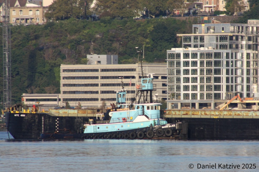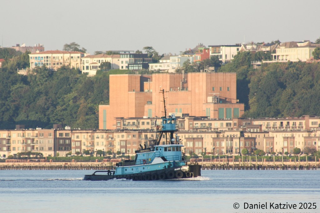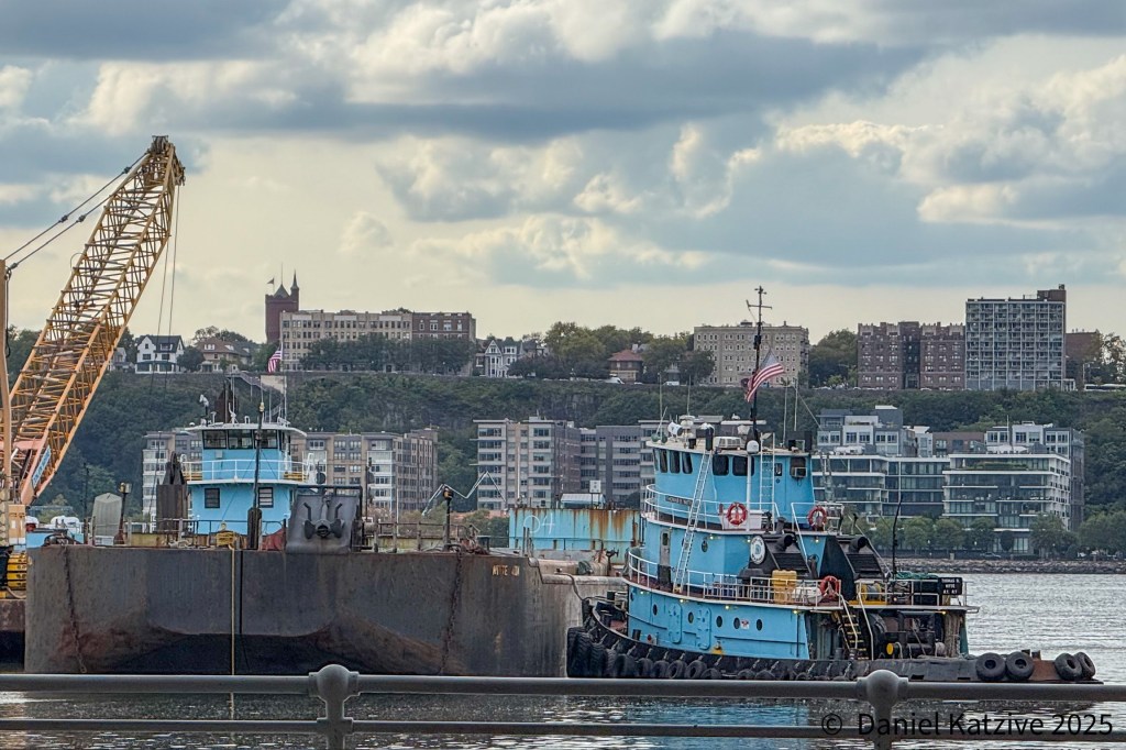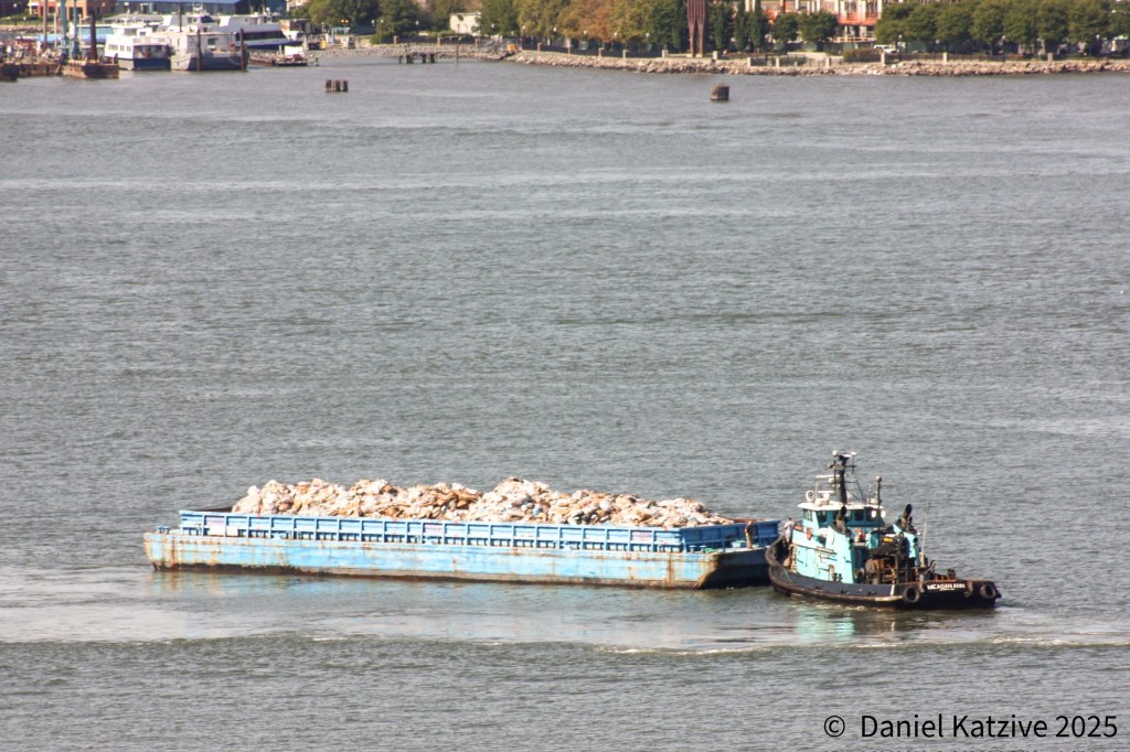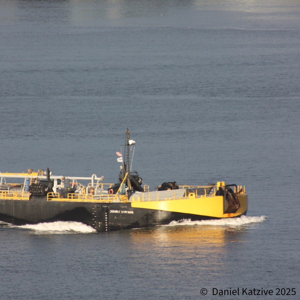Donjon Marine’s distinctive blue livery was very much in evidence on the North River last week. In addition to regular work moving recycled paper collected by DSNY in Manhattan from Pier 99 to the recycling mill on Staten Island, seasonal dredging was underway at the cruise terminal. The cruise terminal quays are dredged regularly to maintain 38 feet of depth below mean low water, and the spoils are hauled to a dump site off Highlands, NJ where they are used to cap historical pollution that occurred there. The destination for dredged material could change at some point: according to a recent Gothamist report, the so-called HARS (historic area remediation site) off Highlands will reach capacity in September 2026 and a new location for dredged material from around the harbor will need to be found.