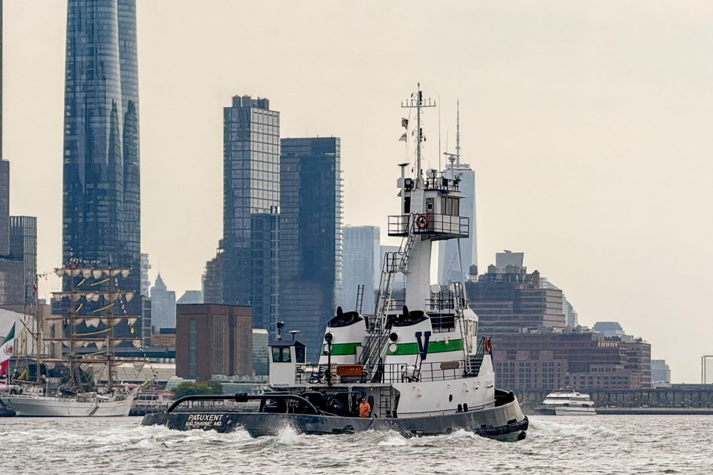 Vane Brothers tug Patuxent ran light down the North River Tuesday afternoon, returning to the Vane base in Red Hook after traveling upriver to visit the Vane tug Philadelphia anchored with a barge off Spuyten Duyvil. They were perhaps delivering crew and/or equipment up there. On the left edge of the photo, the Mexican tall ship Cuauhtémoc is visible moored at the end of Pier 86.