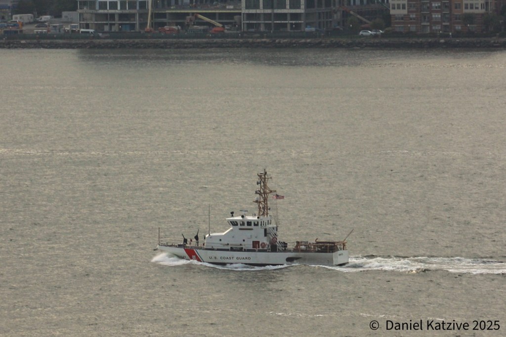 Numerous Coast Guard and NYPD vessels were enforcing a full closure of the East River as world leaders gathered Tuesday at the UN, including local response boats, some of Bayonne’s black-hulled cutters, and the 154-foot fast response cutter William Chadwick down from Boston. Things were quieter on the North River, but the Sandy Hook patrol boat Bonito did make a trip up as far as the GW Bridge before turning around to anchor overnight in Gravesend Bay. The 89-foot Bonito is the only white-hulled cutter based in New York Harbor. As of Thursday morning, Bonito is closer to home, currently in Sandy Hook Bay.