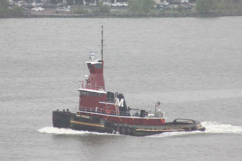 Mary Turecamo passed down the North River in Sunday afternoon rain, running light on her way back to the harbor. Mary was coming from assist work up north, helping the bulk ship Amis Wisdom VI which had called on Port of Coeymans last week navigate from Catskill NY to Hyde Park. See Glenn Raymo post on this FB link for photos of the assist work up there: