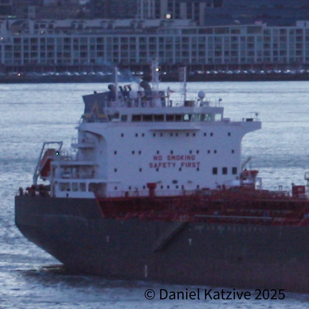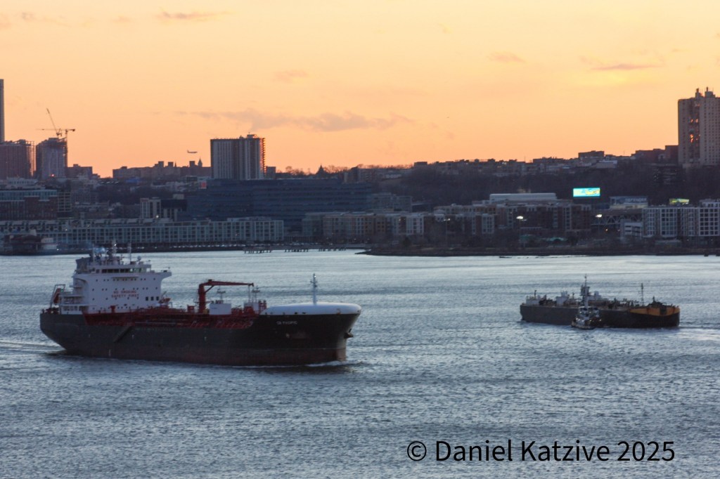 Buchanan 5 appears to be filling in for Buchanan 12 on the daily Clinton Point quarry run. Five was towing her empty hoppers astern as she headed back north Tuesday morning, which is not a configuration we see very often for tows heading upriver. Meanwhile, 12 appears to be at Caddell’s Dry Dock currently. Hoppers loaded with crushed dolomite rock are brought down from the quarry at Clinton Point near Poughkeepsie on a daily basis to the moorings off Greenville, Jersey City. Empties travel the other way.