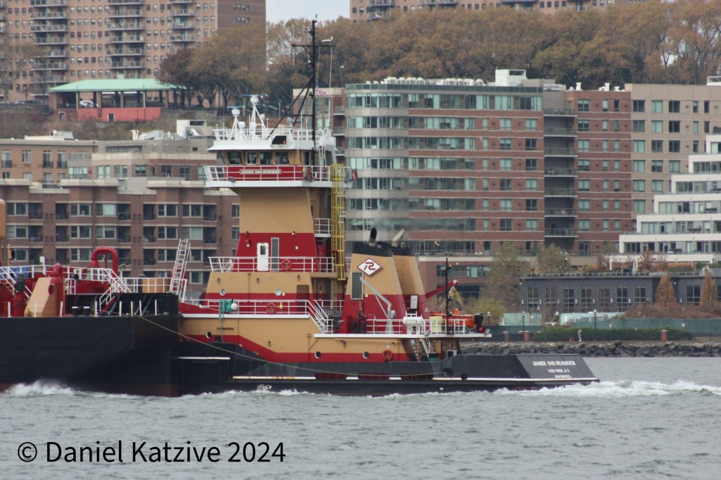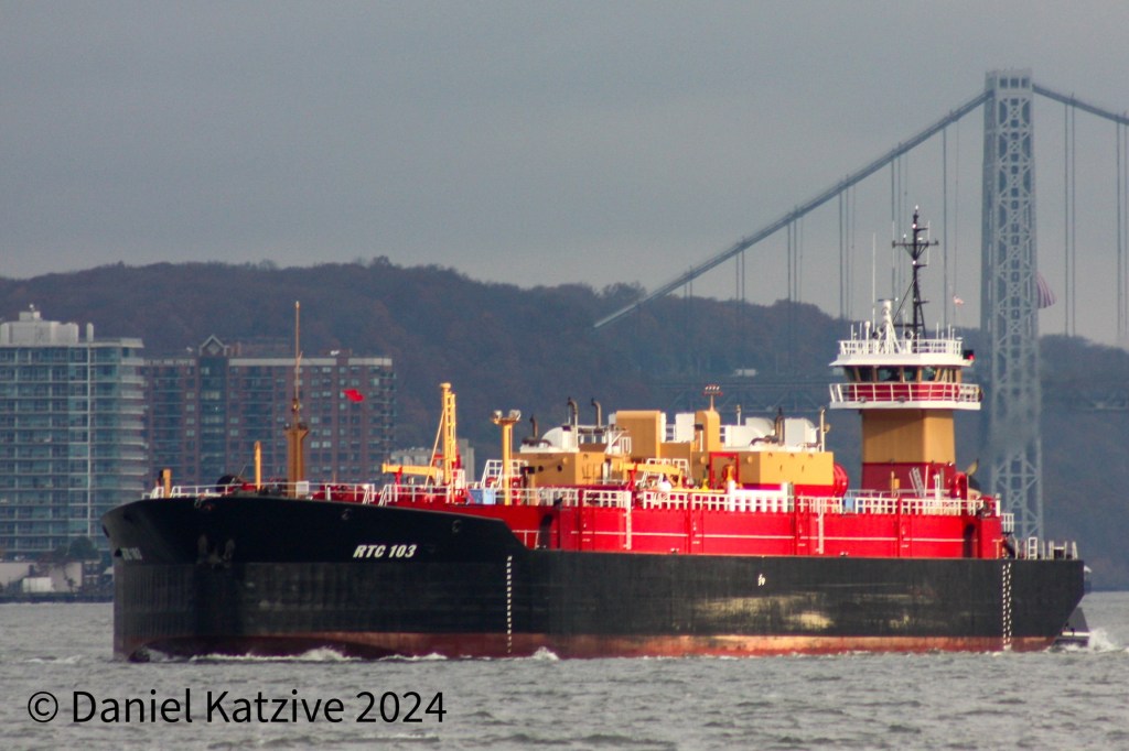 The Janice Ann Reinauer/RTC 103 combination caught the morning light as they made a wide turn with the ebb tide off North Bergen Monday morning. The ATB had made a brief detour up the North River on the way back from New Haven before turning and heading for the Kills and, probably, a new cargo to load. If you look closely, you can see a bit of the American flag flying on the GWB’s western tower for Veterans Day.