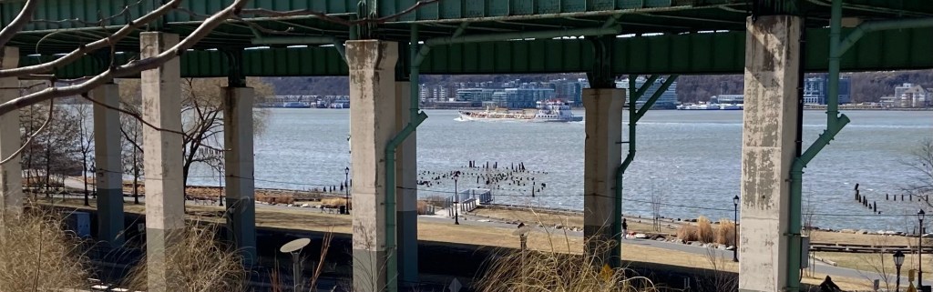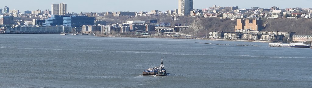 Norwegian Gem arrives as Dann Marine boats standby for bunkering The DEP’s North River tanker was servicing the North River sewage plant, hauling away residual solids (sludge) for dewatering at the Wards Island plant. The NY Waterway Edgewater ferry passes heading south. NY Waterway runs rush hour weekday to Edgewater Landing. A similar service used to run from an area just south of there to a dock at 125th Street until the 1960s.